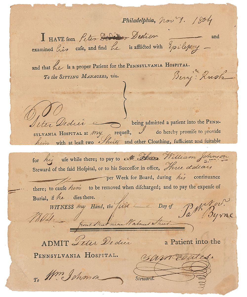 Physician and surgeon general of the Continental Army who signed the Declaration of Independence (1746–1813). Scarce partly-printed DS, signed “Benj’n Rush,” one page, 6.75 x 8.25, November 1, 1804. In part: “I have seen Peter Dedier and examined his case, and find that he is afflicted with Epilepsy and that he is a proper Patient for the Pennsylvania Hospital.” Signed at the conclusion of this section by Rush. Lower portion of the document pertains to the financial obligations of being treated at the hospital, including costs of possible burial. In very good condition, with intersecting folds with complete separation to central horizontal fold and partial separation to one lower edge, and some scattered staining.