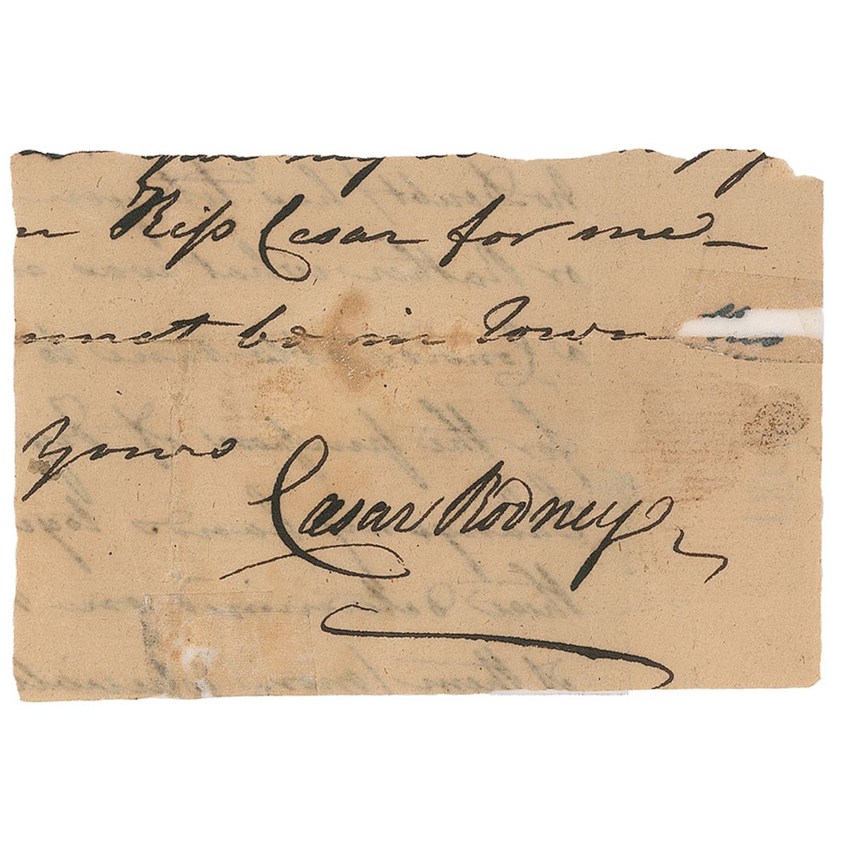 Signer of the Declaration of Independence from Delaware (1728–1784), military officer, Continental Congressman, and President of Delaware. Ink signature, “Caesar Rodney,” on an off-white 3.5 x 2.25 slip clipped from a larger letter or document. Tape reinforcement along reverse of vertical folds, small area of paper loss to right edge, a bit of scattered toning, and some show-through from writing on reverse, otherwise fine condition.