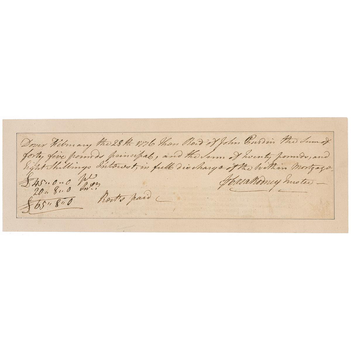 ADS, signed “Caesar Rodney Trustee,” one page, 10 x 2.75, February 28, 1776. Financial receipt reads in part: “Dover February the 28th 1776 then Recd of John Purdin the Sum of forty five pounds principal, and the Sum of twenty pounds, and Eight Shillings Interest, in full discharge of the within mortgage.” Document is inlaid into a slightly larger sheet. In fine condition, with a mild shade of toning, and some light show-through from text on reverse.