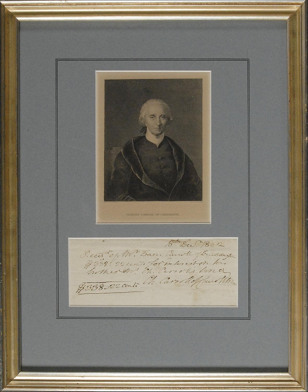 Signer of the Declaration of Independence from Maryland (1737–1832) who was the longest-lived among his colleagues. DS, signed “Ch. Carroll of Carrollton,” one page, 6 x 2.25, December 8, 1802. Document reads, in full: “Recei[ve]d of Mr. Dan. Carroll of Duiddngton [sic] $338- 22 cents for interest his brother Ch. Carroll’s bond.” Matted and framed, by Goodspeed’s Book Shop, the legendary Boston bookshop, with an engraved portrait to an overall size of 11 x 14. Intersecting folds, and some scattered light toning, otherwise fine condition. Not only the longest surviving Signer, Carroll enjoyed remarkable success as a planter and businessman.