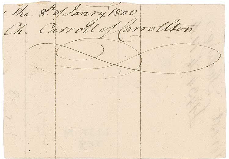 Signer of the Declaration of Independence from Maryland (1737–1832) who was the longest-lived among his colleagues. Ink signature, “Ch. Carroll of Carrollton,” dated above “the 8th of Janry 1800,” on an off-white 3.5 x 2.5 slip. In fine condition, with two vertical lines affecting a couple letters of signature, and light show-through from docketing on reverse. Pre-certified John Reznikoff/PSA/DNA and RRAuction COA.