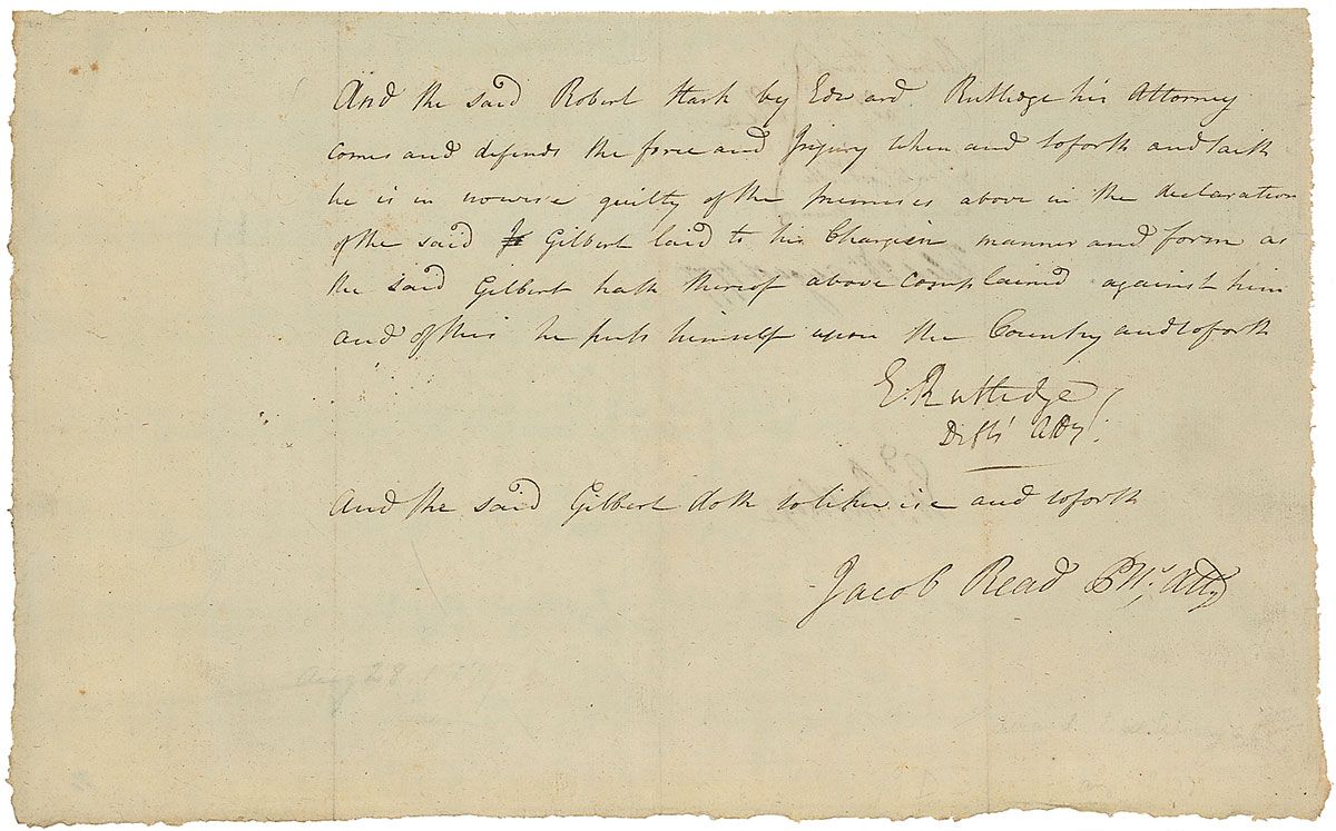 Signer of the Declaration of Independence from South Carolina (1749–1800). Revolutionary War-dated ADS, signed “E. Rutledge, Dfts Atty,” one page, 12.75 x 8, August 28, 1777. Legal document reads, in part, “And the said Robert Hank…and Rutledge his Attorney comes and defends...and saith he is in no way guilty of the premises above in the declaration.” Document is inlaid into a slightly larger sheet. Intersecting folds, one through a single letter of signature, and some light show-through from docketing on reverse, otherwise fine condition. In his 1995 reference History Comes to Life, Kenneth Rendell places Rutledge’s autograph material into the ‘scarce’ category among the Signers.