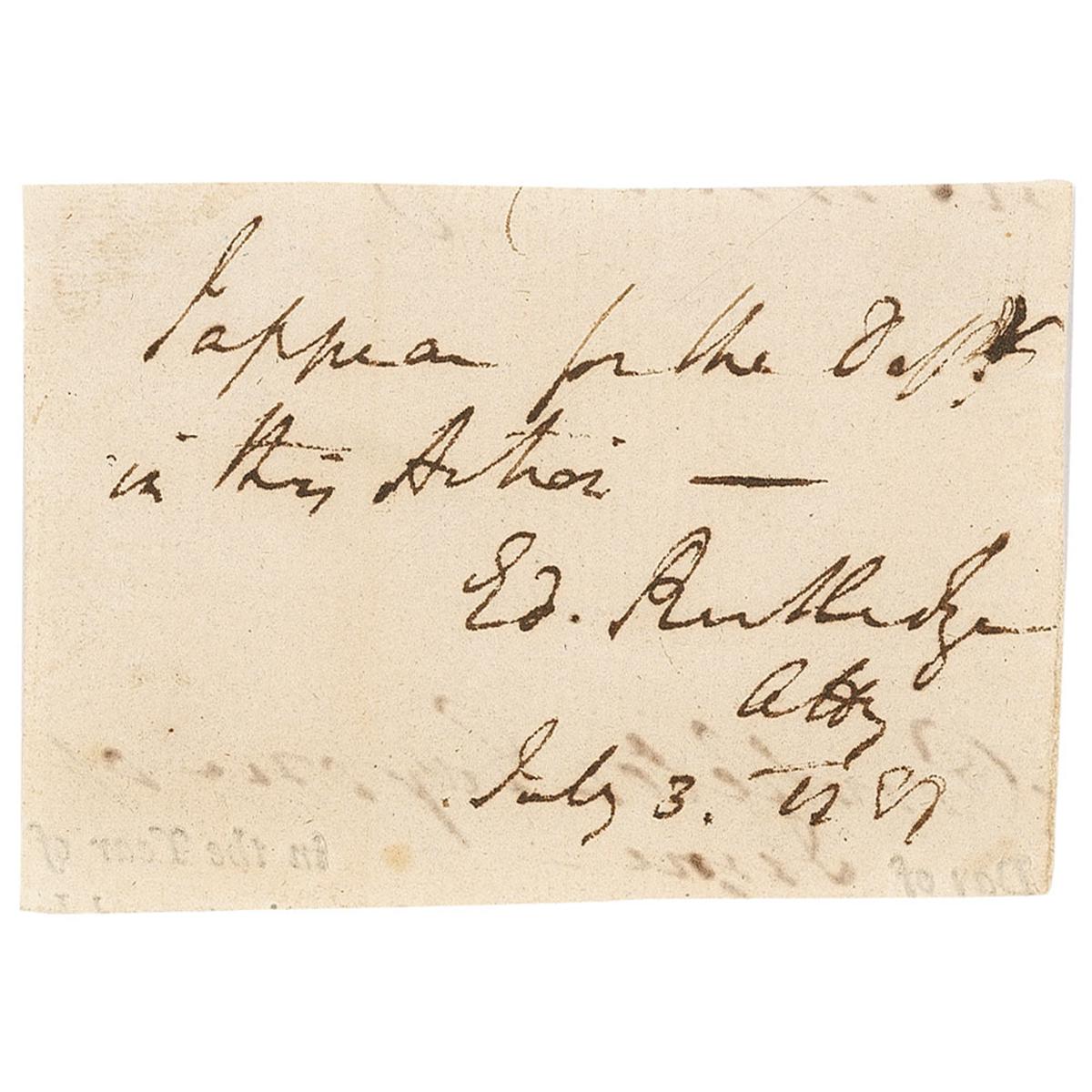Signer of the Declaration of Independence from South Carolina (1749–1800). Handwritten endorsement, signed “Ed. Rutledge Atty,” on an off-white 3.25 x 2.25 slip, clipped from a larger legal document, dated July 3 [1787?]. In full: “I appear for the Defs. in this action.” In fine condition, with light show-through from text and writing on reverse. In his 1995 reference History Comes to Life, Kenneth Rendell places Rutledge’s autograph material into the “scarce” category among the Signers.