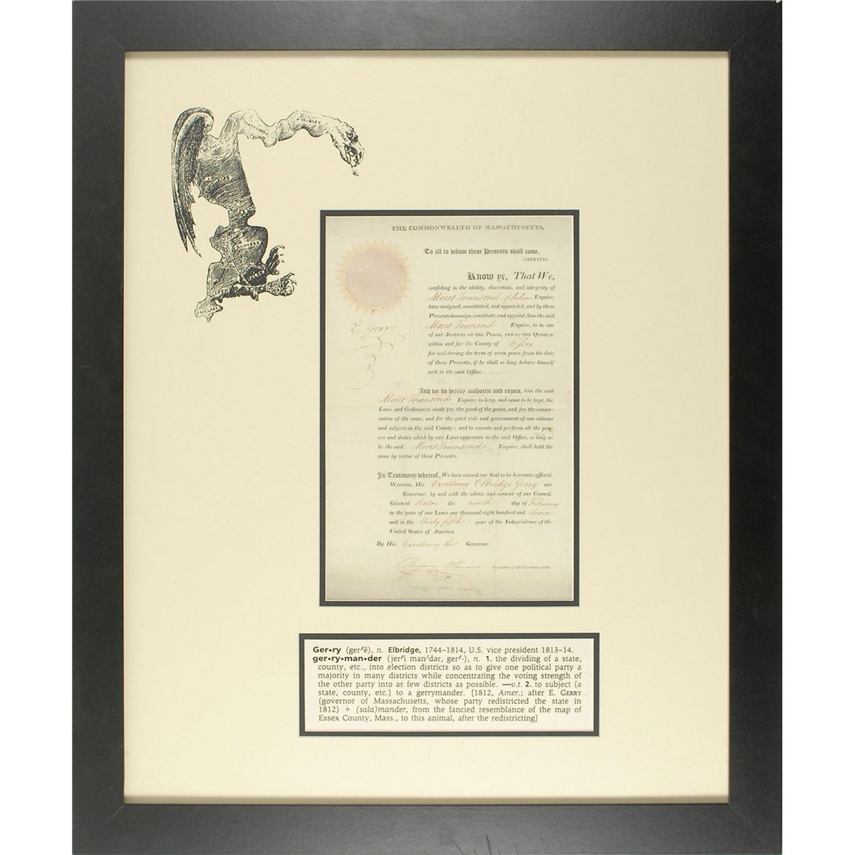 Partly-printed DS, signed “E. Gerry,” one page, 8.75 x 14, February 9, 1811. Gerry, as governor of Massachusetts, appoints Moses Townsend “to be one of our Justices of the Peace, and of the Quorum within and for the county of Essex.” Signed in the left border by Gerry, and countersigned at the bottom by the commonwealth’s secretary. Double-matted and framed with a printed dictionary definition of his name and ‘gerrymander’ to an overall size of 25.5 x 31.5. Matte features an attractive print of the famous 1812 political cartoon of Gerry’s bizarrely redistricted Essex County with wings and a dragon’s head; likened to the shape of a salamander, the scandalous new electoral districts—formed to favor his own Democratic-Republican candidates over the Federalists—gave rise to the still-popular term ‘gerrymander,’ a combination of the governor’s last name and the twisting creature. In fine condition, with intersecting folds and some slight show-through from docketing on reverse. The paper seal is crisp and intact. Oversized.