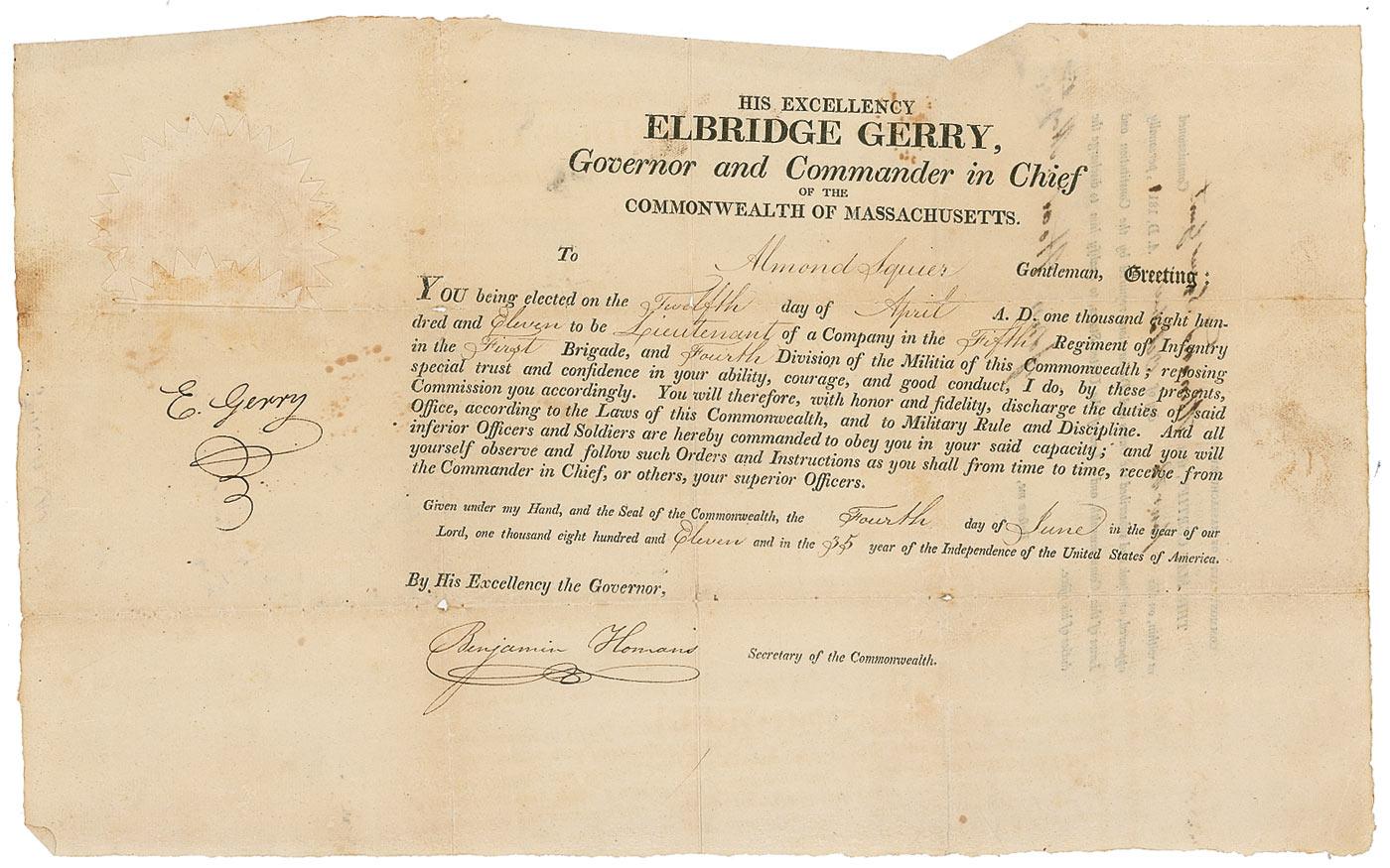 Partly-printed DS, signed “E. Gerry,” one page, 15 x 9.5, June 4, 1811. Gerry, as governor of Massachusetts, signs a military commission appointing Almond Squier a “Lieutenant of a Company in the Fifth Regiment of Infantry of the First Brigade, and Fourth Division of Militia of this Commonwealth.” Signed on the left side by Gerry. In very good condition, with a few small separations along intersecting folds, small areas of paper loss at junction of folds, scattered light toning and foxing, and light show-through from writing on reverse. The white paper seal is folded and lightly toned, but intact. Gerry’s signature is very crisp and bold, and unaffected by the flaws. In his 1995 reference History Comes to Life, Kenneth Rendell places Gerry’s autograph material into the “rare” category among the Signers. Pre-certified John Reznikoff/PSA/DNA and RRAuction COA.