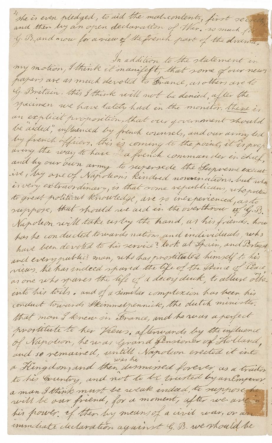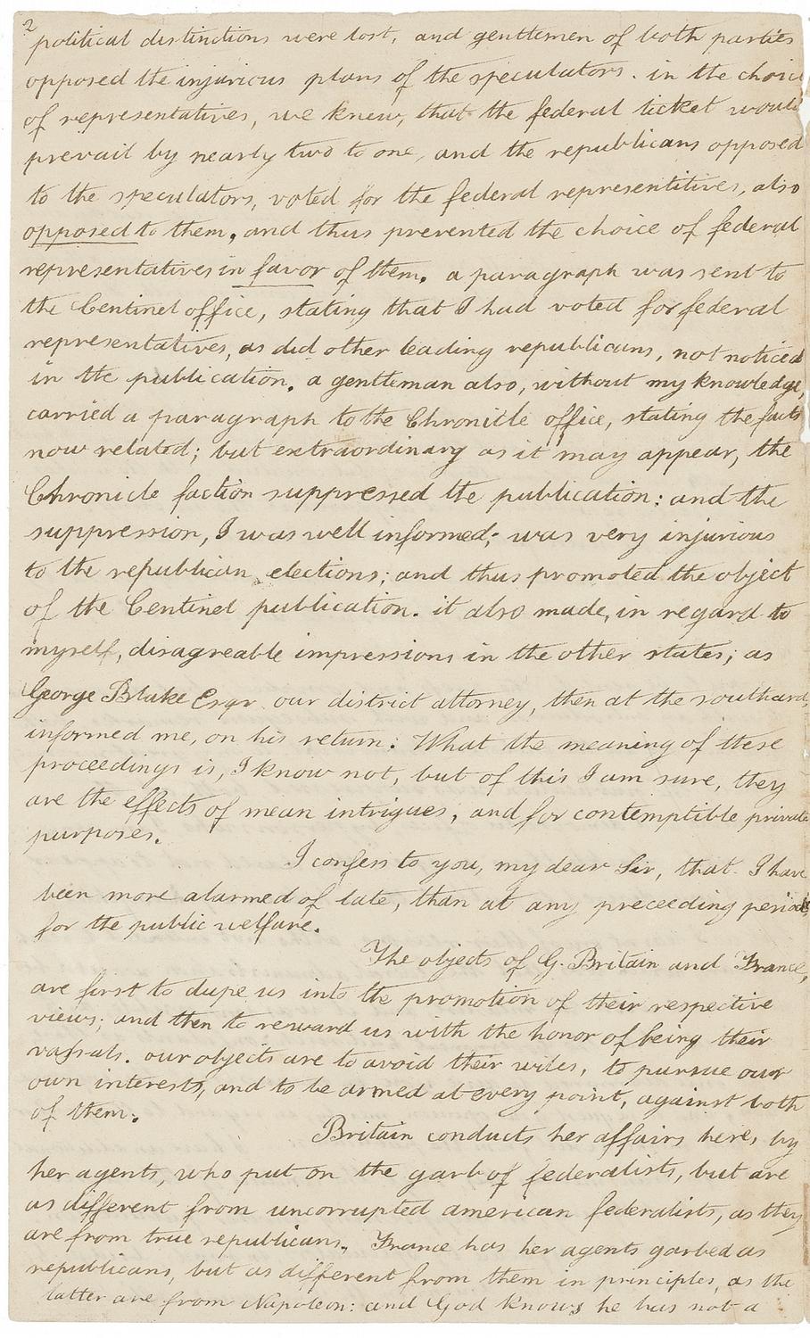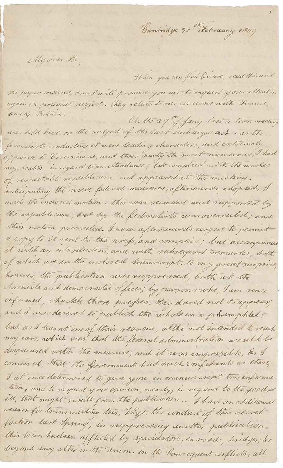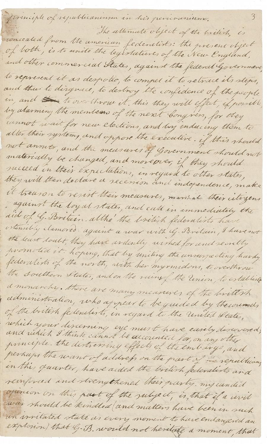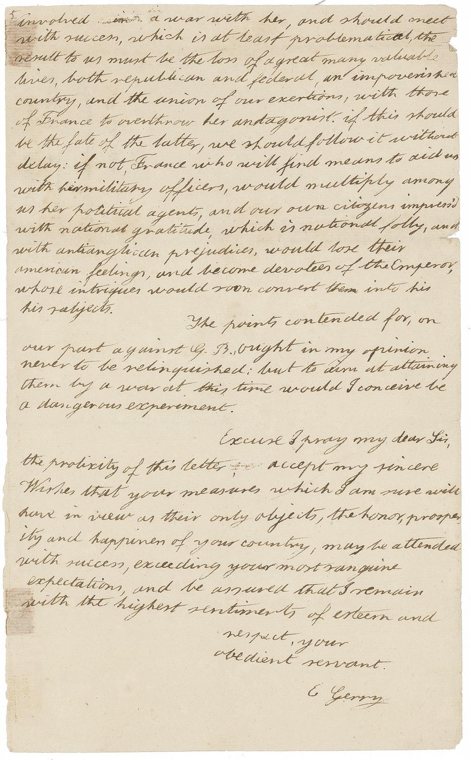 ALS signed “E. Gerry,” five pages on three sheets, 7.25 x 12, February 20, 1809. Retained copy of Gerry’s letter to Secretary of State and President-elect President James Madison. Docketed by Gerry on verso of fifth page “Copy of a letter to his Excelly James Madison President of the U States, 20th Feby 1809.” In part: “When you can find leisure, read this and the paper enclosed [photocopy present], and I will promise you not to request your attention again on political subjects. they relate to our concerns with France, and G. Britain. On the 27th of Jan'y last a town meeting was held here, on the subject of the last embargo act. as the federalists conducting it were leading characters, and extremely opposed to Government, and their party the most numerous, I had my doubts in regard to an attendance; but complied with the wishes of respectable republicans, and appeared at the meeting. Anticipating the severe federal measures, afterwards adopted, I made the enclosed motion. This was recorded and supported by the republicans, but by the federalists was overruled; and their motion prevailed. I was afterwards urged to permit a copy to be sent to the press, and complied; but accompanied with it an introduction, and with subsequent remarks, both of which were in the enclosed transcript [photocopy of the transcript, in the “The James Madison Papers” at the Library of Congress, is present]. To my great surprise however, the publication was suppressed, both at the Chronicle and democratic offices; by persons who, I am since informed, shackle those presses. They dared not to appear, and I was desired to publish the whole in a pamphlet but as I learnt one of their reasons, altho’ not intended to reach my ears, which was, that the federal administration would be displeased with the measure; and it was impossible, as I conceived, that the Government had such confidants as these, I at once determined to give you in manuscript this information, and to request your opinion, merely in regard to the good, or ill, that might result from the publication… I confess to you, my dear Sir, that I have been more alarmed of late, than at any preceding period for the public welfare. The objects of G. Britain and France, are first to dupe us into the promotion of their respective views; and then to reward us with the honor of being their vassals. our objects are to avoid their wiles, to pursue our own interests, and to be armed at every point, against both of them. Britain conducts her affairs here, by her agents, who put on the garb of federalists, but are as different from uncorrupted American federalists, as they are from true republicans. France has her agents garbed as republicans, but as different from them in principles, as the latter are from Napoleon: and God knows he has not a principle of republicanism in his pericranium. The ultimate object of the British, is concealed from the American federalists: the present object of both, is to unite the legislatures of the New England and other commercial States, against the federal Government, to represent it as despotic, to compel it to retrace its steps, and thus to disgrace, to destroy, the confidence of the people, and to overthrow it. This they will effect, if possible, by alarming the members of the next Congress, for they cannot wait for new elections, and by inducing them to alter they systems, and oppose the executive. If this should not answer, and the measures of Government should not materially be changed, and moreover, if they should succeed in their expectations, in regard to other states, they will declare a secession and independence, make it treason to remit their measure, marshal their citizens against the loyal stats, and call in immediately the aid of G. Britain. Altho’ the British federalists have ostensibly clamored against a war with G. Britain, I have not the least doubt, they have ardently wished for and recently promoted it: hoping, that by uniting the unsuspecting hardy federalists of the north, with her myrmidons, to overthrow the southern States, and on the ruins of the Union, to establish a monarchy. there are many measures of the British administration, who appear to be guided by the counsels of the British federalists, in regard to the United States, which your discerning eye must have easily discovered; and which I think cannot be accounted for, on any other principle…G. B. would not hesitate for a moment, that she is ever pledged, to aid the mal-contents, first secretly and then by an open declaration of War. So much for G.B., and now for a view of the French part of the drama. In addition to the statement in my motion, I think it manifest, that some of our news papers are as much devoted to France, as others are to G. Britain. This I think will not be denied, after the specimen we have lately had in the monitor. There is an explicit proposition that our government should be ‘aided,’ influenced by French counsels, and our army led by French officers. This is coming to the point, it is preparing the way to have a French commander in chief, and by our own army to supersede the Supreme executive, by one of Napoleon’s kindred nominations. But what is very extraordinary, is that some republicans, who pretend to great political knowledge, are so inexperienced, as to suppose, that should we aid in the overthrow of G.B. Napoleon will take us by the hand, as his friends. How has he conducted toward nations, and individuals, who have been devoted to his service? Look at Spain, and Portugal, and every public man who has prostituted himself to his views. He has indeed spared the life of the Prince of Peace [Pope Pius VII who, in order to retain Napoleon’s friendship, agreed to crown him as Emperor in 1804] as one who spares the life of a decoy duck, to allure others into his toils. And of a similar complexion has been his conduct towards Skimmelpennick, the Dutch minister. That man I knew in France, and he was 