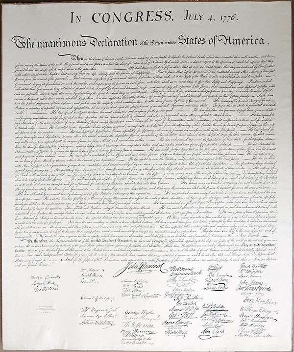 Declaration of Independence - Engraved By E.M. Weeks, 1939. Hand-engraved exact facsimile of the original Declaration, from a steel plate ordered by the Bureau of Engraving and Printing in 1936. Engraver Edward M. Weeks spent 1,318½ hours engraving the 26 x 31 in. steel plate that was finished in 1939. At lower left of the document is printed: "Facsimile of the Original / Engraved on Steel at the Bureau of Engraving and Printing by E.M. Weeks, Sc / 1939." Laid to board. The model for this intaglio print was from a photograph of the original Declaration of Independence taken by Levin C. Handy in 1903.