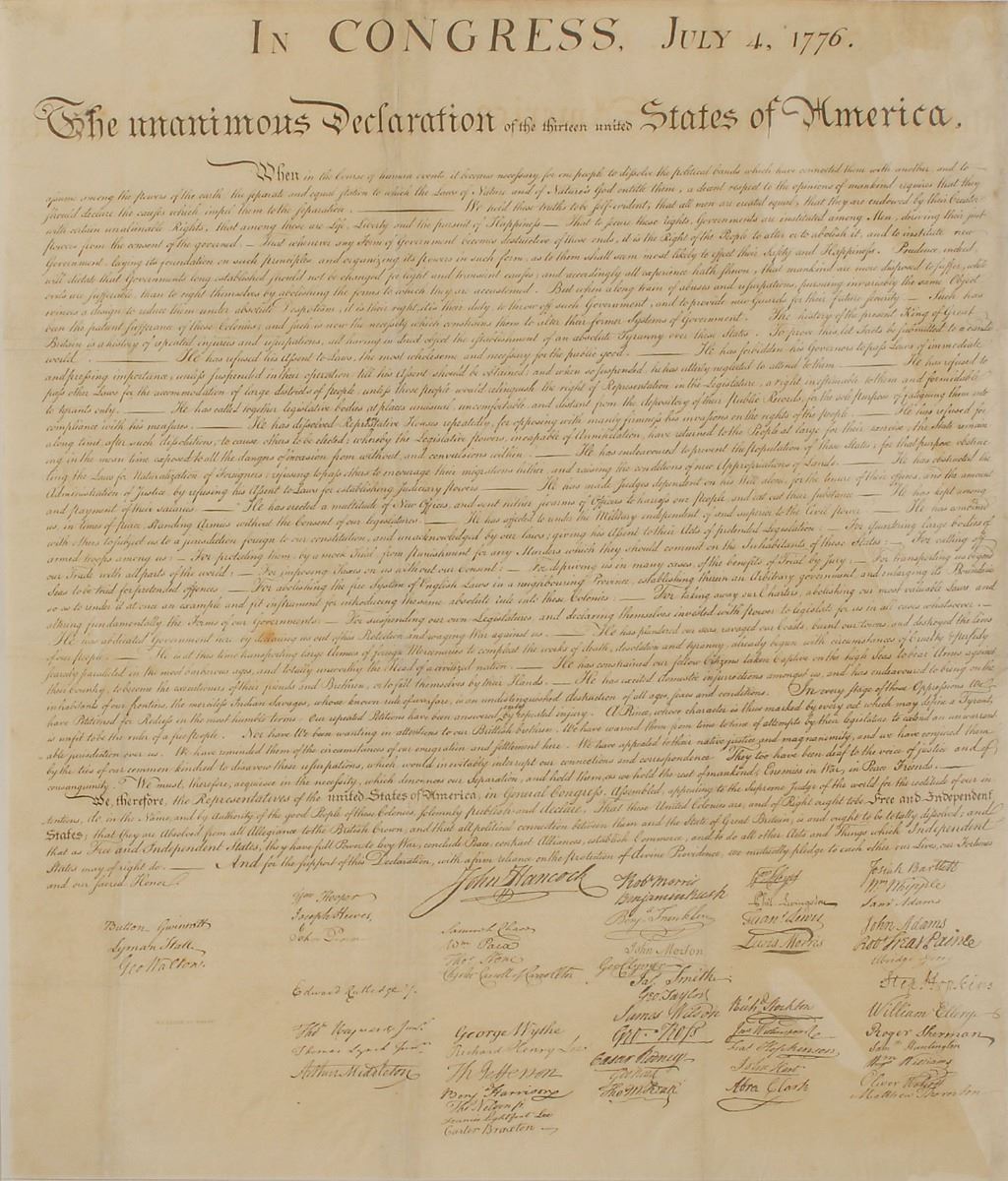 Striking rice paper engraving of the Declaration of Independence, 25.5 x 29, printed by Peter Force in 1848 for inclusion in his series American Archives, beginning, “In Congress, July 4, 1776. The Unanimous Declaration of the Thirteen United States of America.” Removably encapsulated in acid-free mylar. In very good to fine condition, with professional reinforcements along folds on the reverse. By 1820, the original Declaration of Independence had seriously deteriorated due to inappropriate handling and storage, creating an immediate need for a facsimile reproduction. Commissioned by John Quincy Adams, William J. Stone engraved a copperplate by lifting ink directly from the original and creating a perfect copy. He printed 201 before placing the plate in storage for safekeeping.