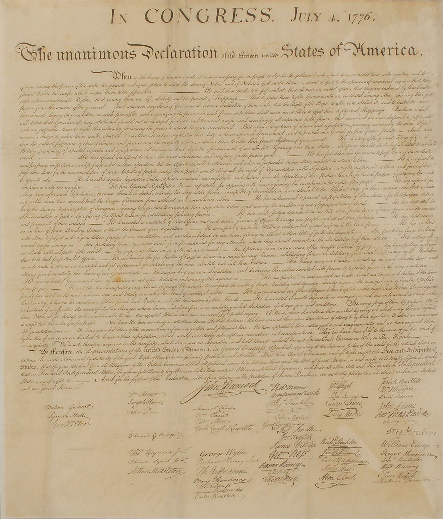 Striking rice paper engraving of the Declaration of Independence, 25.5 x 29, printed by Peter Force in 1848 for inclusion in his series American Archives, beginning, "In Congress, July 4, 1776. The Unanimous Declaration of the Thirteen United States of America." Removably encapsulated in acid-free mylar. In very good to fine condition, with professional reinforcements along folds on the reverse. By 1820, the original Declaration of Independence had seriously deteriorated due to inappropriate handling and storage, creating an immediate need for a facsimile reproduction. Commissioned by John Quincy Adams, William J. Stone engraved a copperplate by lifting ink directly from the original and creating a perfect copy. He printed 201 before placing the plate in storage for safekeeping.