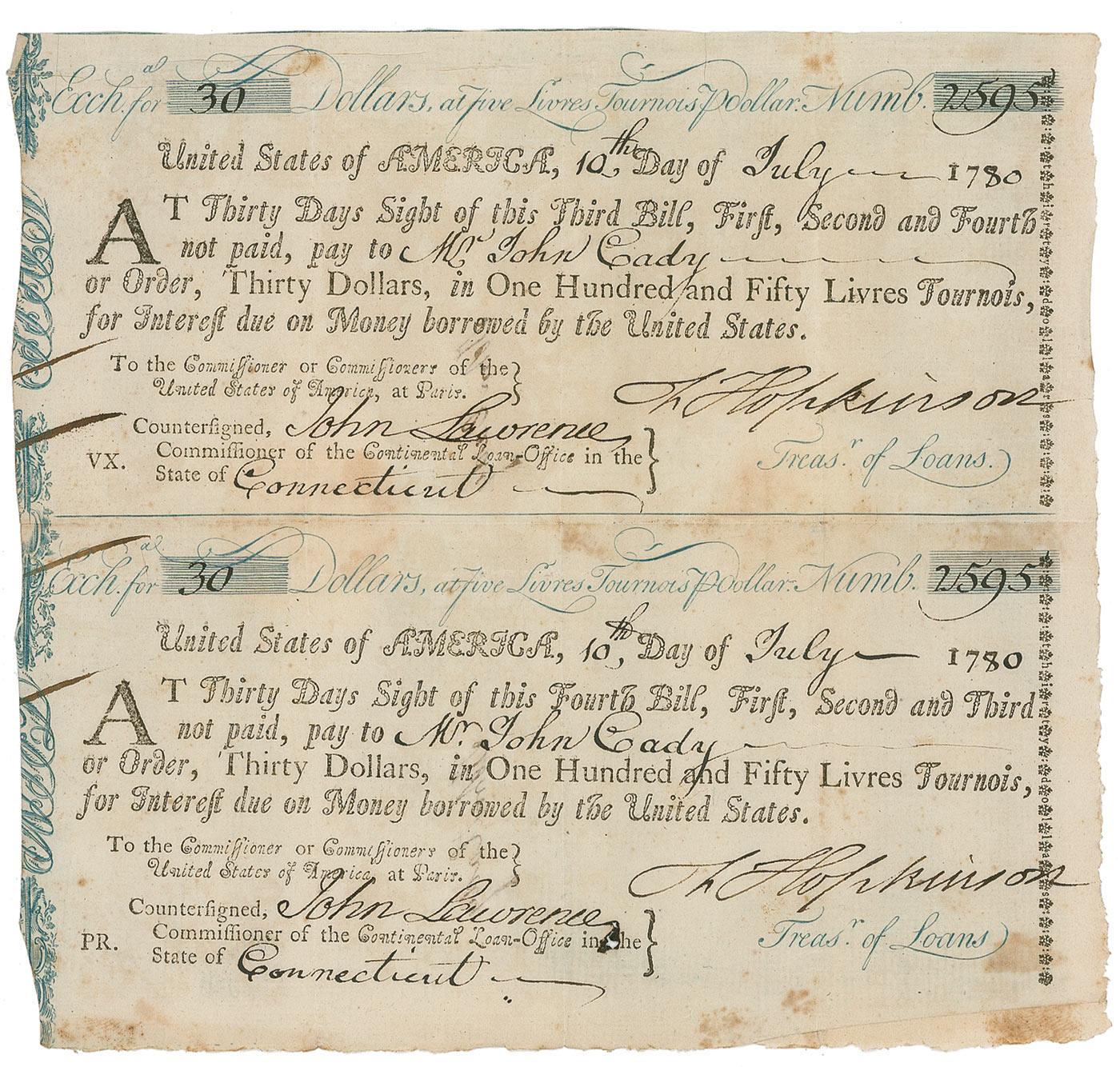 Signer of the Declaration of Independence from Rhode Island (1707–1785) and a delegate to the Continental Congress. Partly-printed DS, signed twice “F. Hopkinson,” one page, 8.25 x 8, July 10, 1780. Two conjoined thirty dollar payments issued to John Cady, payable “in One Hundred and Fifty Livres Tournois, for interest due on Money borrowed by the United States,” each signed at the conclusion by Hopkinson as Treasurer of Loans. In very good condition, with intersecting folds, one through a single letter of each signature, scattered toning, mild edge wear, a couple small spots of ink erosion, and some light creasing and wrinkling. Both of Hopkins’s signatures are quite bold and prevalent.