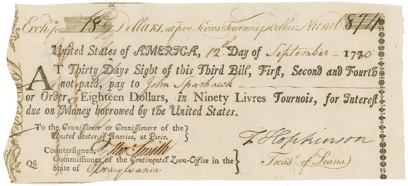 Signer of the Declaration of Independence from New Jersey (1737–1791) who attained additional historical import as one of the designers of the original American flag and the first native-born American composer. Partly-printed DS, signed “F. Hopkinson,” one page, 8.25 x 3.5, September 12, 1780. A sight draft issued to John Spanhawk for “ Eighteen Dollars, in Ninety Livres Tournois, for interest due on Money borrowed by the United States,” signed at the conclusion by Hopkinson as Treasurer of Loans. Light wrinkling and creasing, scalloped left edge, and show-through from endorsement on reverse, otherwise fine condition.