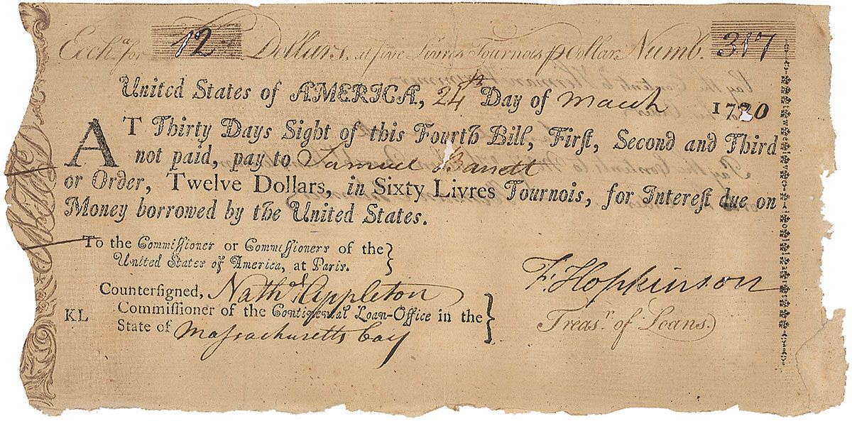Signer of the Declaration of Independence from New Jersey (1737–1791), and a delegate to the Continental Congress. Partly-printed DS , signed “F. Hopkinson,” one page, 8.25 x 4.25, March 24, 1780. Bill of exchange, in full: “At Thirty Days Sight of this Fourth Bill, First, Second and Third not paid, pay to Samuel Banett or Order, Twelve Dollars, in Sixty Livres Tournois, for Interest due on Money borrowed by the United States.” Vertical folds, one through a single letter of signature, a bit of scattered ink erosion (not affecting legibility or signature), and a rough right edge, otherwise fine condition.