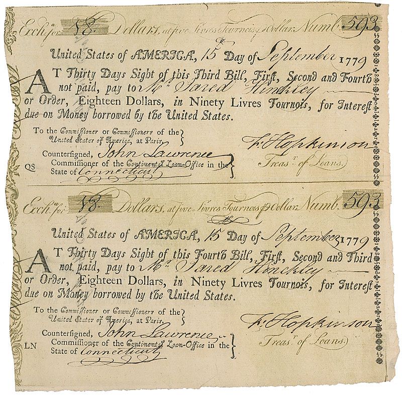 Signer of the Declaration of Independence from New Jersey (1737-1791) and a delegate to the Continental Congress. Revolutionary War-dated partly-printed DS, signed “F. Hopkinson,” one page, 8 x 8, September 15, 1799. Two interest coupons payable to Jared Hinckley for $18.00 each “for interest due on Money borrowed by the United States.” Each signed by Hopkinson as Treasurer of Loans. In fine condition, with some scattered light toning.
