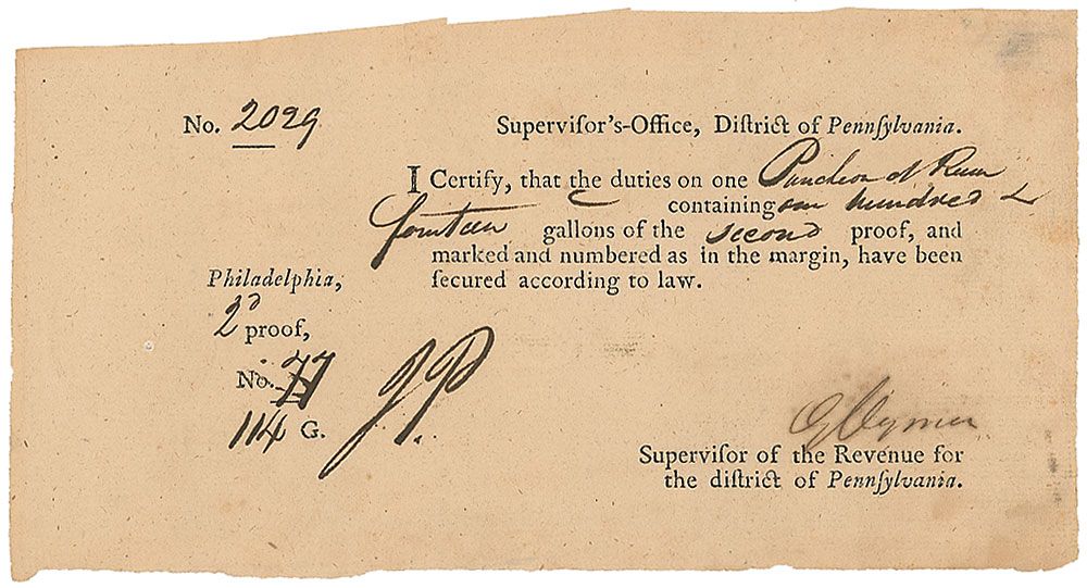 Partly-printed DS, signed “G. Clymer,” one page, 8 x 4, no date. Tax document certifying that “the duties on one Puncheon of Rum containing one hundred fourteen gallons of the second proof, and marked and numbered as in the margin, have been secured according to law.” An irregularly trimmed upper edge and subtle haloing to the signature, otherwise fine condition.