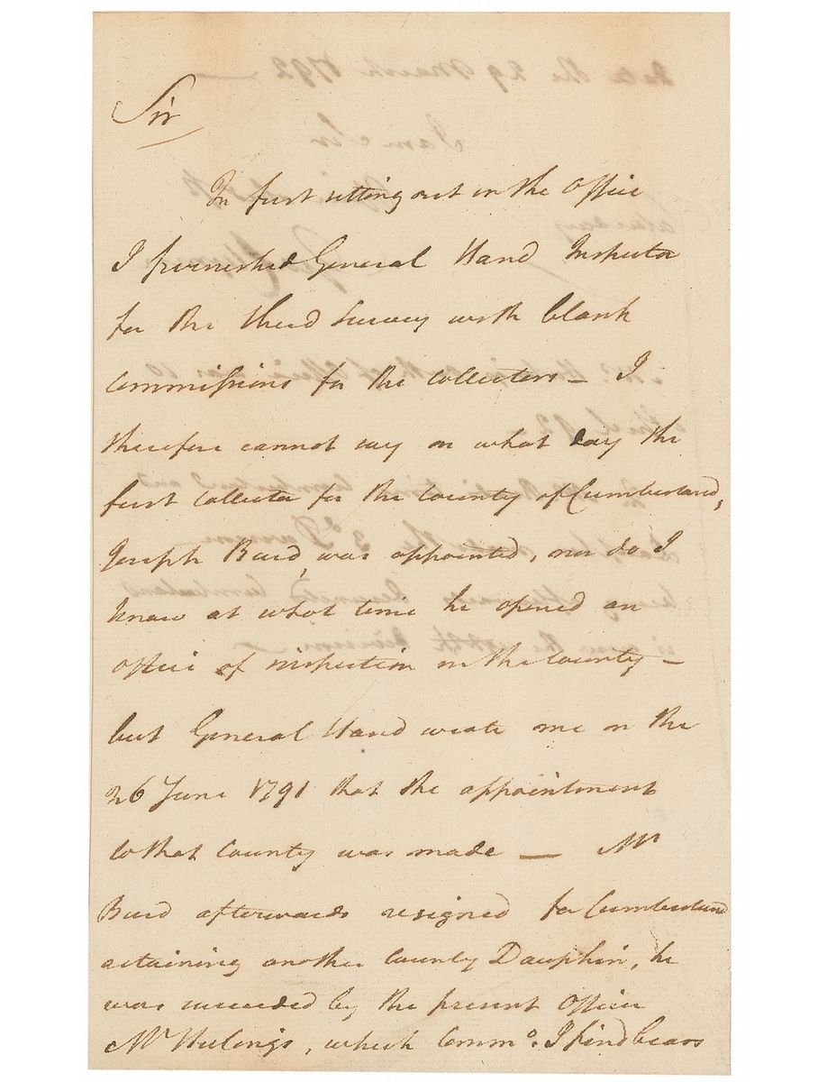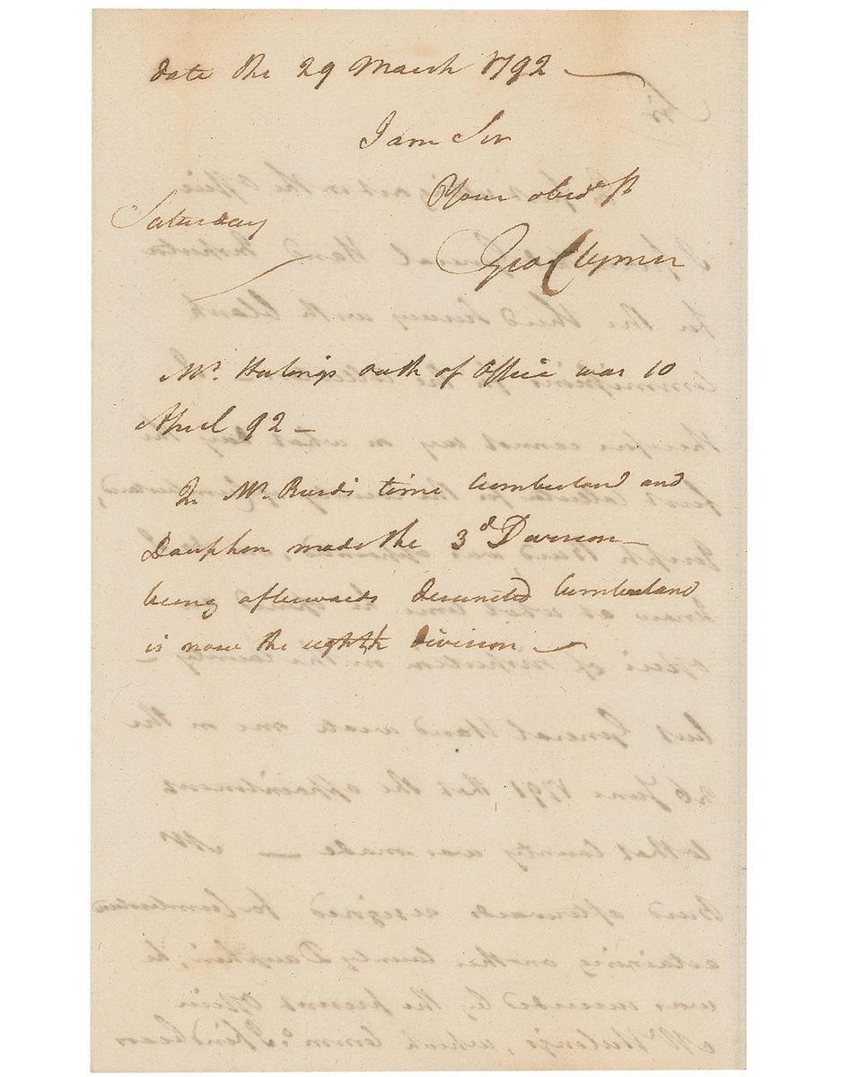Signer of the Declaration of Independence, and founder and president of the Bank of Philadelphia (1739–1813). ALS signed “Geo. Clymer,” one page both sides, 5 x 8, March 29, 1792. Letter to a gentleman. In part: “I therefore cannot say on what day the first collector for the county of Cumberland…was appointed, nor do I know at what time he opened an office of inspection in the county.” In fine condition, with show-through from writing to opposing sides.