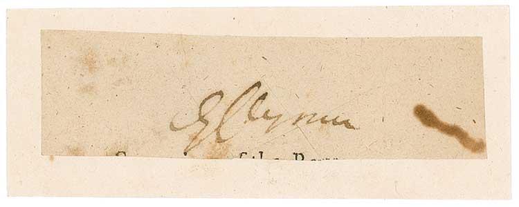 Signer of the Declaration of Independence; founder and president of the Bank of Philadelphia. Ink signature, “G. Clymer,” on an off-white 3.25 x 1 slip affixed to a slightly larger slip. In very good condition, with signature a couple shades light, very fine and thin diagonal cuts through signature, and some scattered light toning and spots. Pre-certified John Reznikoff/PSA/DNA and RRAuction COA.