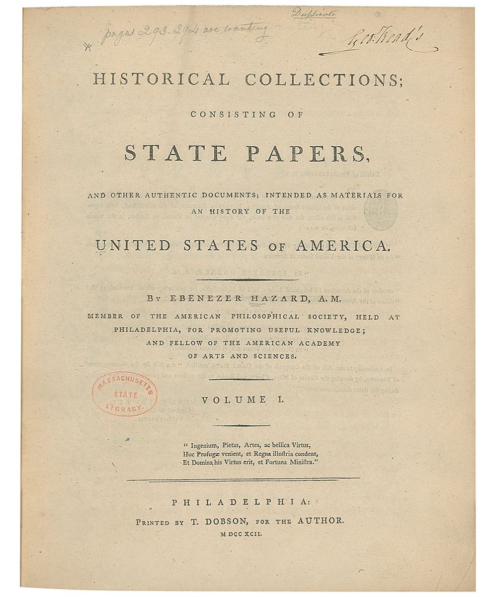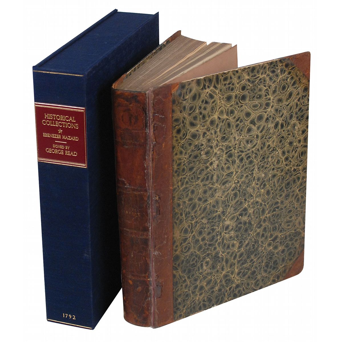 Signer of the Declaration of Independence from Delaware (1733–1798). Signed book: Historical Collections; consisting of state papers and other authentic documents; intended as materials for an history of the United States of America. Philadelphia: T. Dobson, 1792. Hardcover, 8.75 x 11, 639 pages. Signed at the top of the title page with an ownership signature, “Geo: Read’s.” Autographic condition: couple pencil notations and library stamps to signed page, otherwise fine. Book condition: Ex-library, G+/None. Half-bound in brown leather with green marbled paper-covered boards; edges worn; one dark ink spot to fore-edge of textblock; leather is brittle and has several large chips, especially along spine; both covers have been reattached, with interior front hinge painted to more closely match the brown endpapers; minimal library markings, including bookplate and pencil note on front pastedown and a small inkstamp on title-page; offsetting from bookplate onto ffep; few pencil notes, including one indicating that pages 293-294 are missing; mild rubbing, soiling, and foxing. In a very attractive NF navy cloth-covered case with red leather title-piece and gilt lettering on spine. A reluctant signer of the Declaration of Independence, books signed by Read are extremely rare with only one other appearing for auction since 1982.