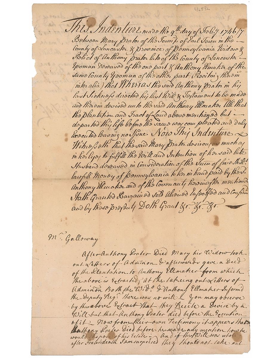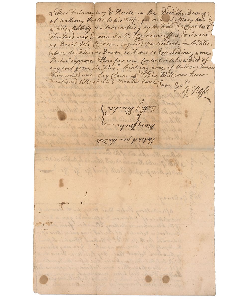 Signer of the Declaration of Independence from Pennsylvania (1730–1779). Rare ALS signed “G. Ross,” one page both sides, 7.75 x 12.5, no date. Letter incorporated into a manuscript document regarding an agreement made between the widow Mary Prater and Anthony Ellmaker, the gentleman with whom her husband had begun a land transaction before he died. The extract indicates that Mary Prater, widow of Anthony Prater, in keeping with his wishes, agrees to sell the said property to Anthony Ellmaker; Prater died before a will could be made out, wherein lies the complication of the case. It seems that Ross was engaged by one of the parties involved to straighten out the situation, which Prater's heirs were contesting. Ross’s letter to Mr. Galloway reads, in full: “After Anthony Prater died Mary his widow took out letters of admin[istrati]on & afterwards gave a deed of the plantation to Anthony Ellmaker from which the above is extracted; at the takeing out letters of adminon. both the wido. & Anthony Ellmaker inform'd the Deputy Regr. there was no will. You may observe by the above extract that they recite a device by a will but that Anthony Prater died before the execution of it. Now from their own testimony it appears that Anthony Prater died before he made any mention how he would dispose of his estate. And if the will was whole after Prater's death I am surprised they should not take out letters testamentary & recite in the deed the device of Anthony Prater to his wife for without Mary had a will Anthony can take nothing by the deed (except her 3d). The deed was drawn in Mr. Cookson's office & I make no doubt Mr. Cookson enquired particularly in the title before the deed was drawn as it was so extraordinary a one, but I suppose Ellmaker was content to take a deed of any sort from the wido. thinking none of Anthony Prater's heirs would ever lay claim. This will was never mentioned till about 6 months since.” In very good condition, with intersecting folds, professionally reinforced on the reverse, scattered light toning and soiling, and a couple small pencil notations. Letter is housed in a blue half-morocco and cloth clamshell case.