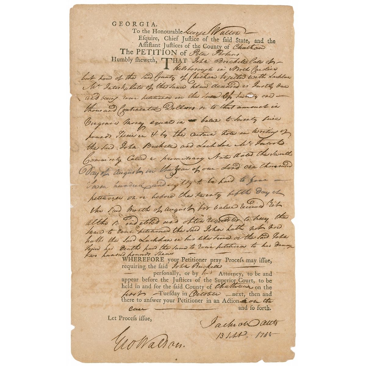 Signer of the Declaration of Independence from Georgia (1741–1804) who later served as that state’s chief justice, governor, and senator. Partly-printed DS, signed “Geo Walton,” one page, 7.75 x 12.5, September 13, 1765. Petition between Peter Perkins and John Brichell regarding a promissory note for “One Thousand Continental Dollars or to that amount in Virginia money equal in value to Seventy five pounds.” Signed at the bottom by Walton as Georgia’s Chief Justice. In very good condition, with professional reinforcement along central horizontal fold, scattered toning and mirroring of ink from folding, a few edge chips, and a few other tape repairs.