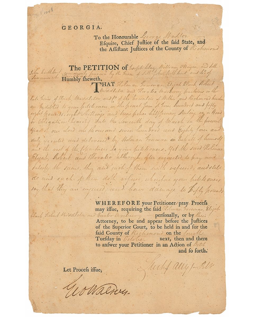 Signer of the Declaration of Independence from Georgia (1741–1804) who later served as that state’s chief justice, governor, and senator. Partly-printed DS, signed “Geo Walton,” one page, 7.75 x 12.25, no date. Walton, as chief justice of Georgia, approves a petition from Seth John Cuthbert and Company of Savannah concerning a debt, boldly signed at the conclusion by Walton. Several horizontal folds, with a couple of repairs along folds on reverse, a repaired tear to top edge, a few edge chips, scattered toning and foxing, and a few small pencil notations, otherwise very good condition.