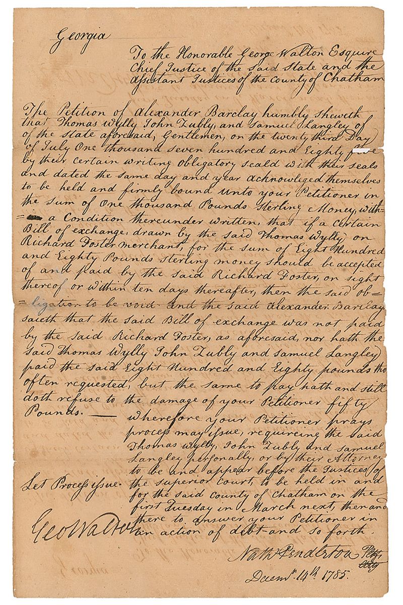 Signer of the Declaration of Independence from Georgia (1741–1804) who later served as that state’s chief justice, governor, and senator. Manuscript DS, signed “Geo Walton,” one page, 8 x 12.5, December 14, 1785. Legal petition to Walton who was then serving as the Chief Justice of the Georgia Supreme Court. In part: “Thomas Wylly, John Tubly, and Samual Langley of the state aforesaid…acknowledged themselves to be held and firmly bound unto your Petitioners in the sum of one thousand Pounds sterling Money…The said bill of exchange was not paid…but the same to pay hath and still doth refuse to the damage of your Petitioner fifty Pounds…wherefore your Petitioner prays process may issue requiring the said Thomas Wylly, John Tubly and Samuel Langley personally, or by their Attorney to be and appear before Justices of the Supreme Court.” Signed in the lower left by Walton. In very good condition, with professional repair to a complete central horizontal separation, light edge chips, uniform toning, and some mild mirroring of ink.