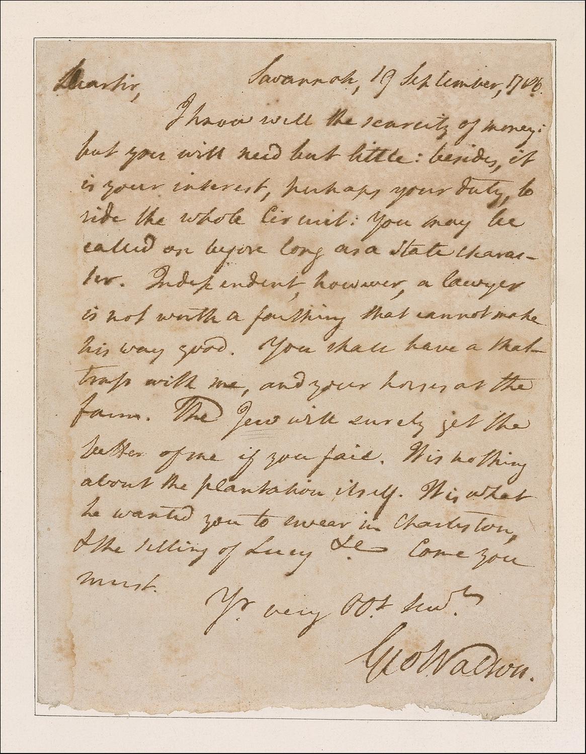 Signer of the Declaration of Independence from Georgia (1741–1804) who later served as that state’s chief justice, governor, and senator. ALS signed “Geo Walton,” one page, 6.5 x 8.5, September 19, 1786. Letter to Seaborn Jones. In full: “I know well the scarcity of money; but you will need but little: besides, it is your interest, perhaps your duty, to ride the whole Circuit. You may be called on before long as a State character. Independent, however, a lawyer is not worth a farthing that cannot make his own way good. You shall have a mattress with me, and your horses at the farm. The Jew will surely get the better of me if you fail. It is nothing about the plantation itself. It is what he wanted you to swear in Charleston, & the selling of Lucy etc. Come you must.” Letter is inlaid by its second integral page to a slightly larger off-white sheet. Second integral page also bears an address panel to Jones in Augusta. In very good condition, with intersecting folds, one through a single letter of signature, and scattered staining, and a somewhat rough bottom edge. Around the time of this letter, Walton had moved to Augusta when the city became the temporary capital of the new state. He was serving as chief justice of the Georgia Supreme Court when he sent this letter to Jones, an attorney who once served as Walton’s clerk. The content is a bit shocking by modern standards, with the slave-holding Southerner referencing “the sale of Lucy,” a politically incorrect concern that “the Jew will surely get the better of me if you paid,” and a frank dismissal of certain attorneys, declaring “a lawyer is not worth a farthing that cannot make his own way good.”