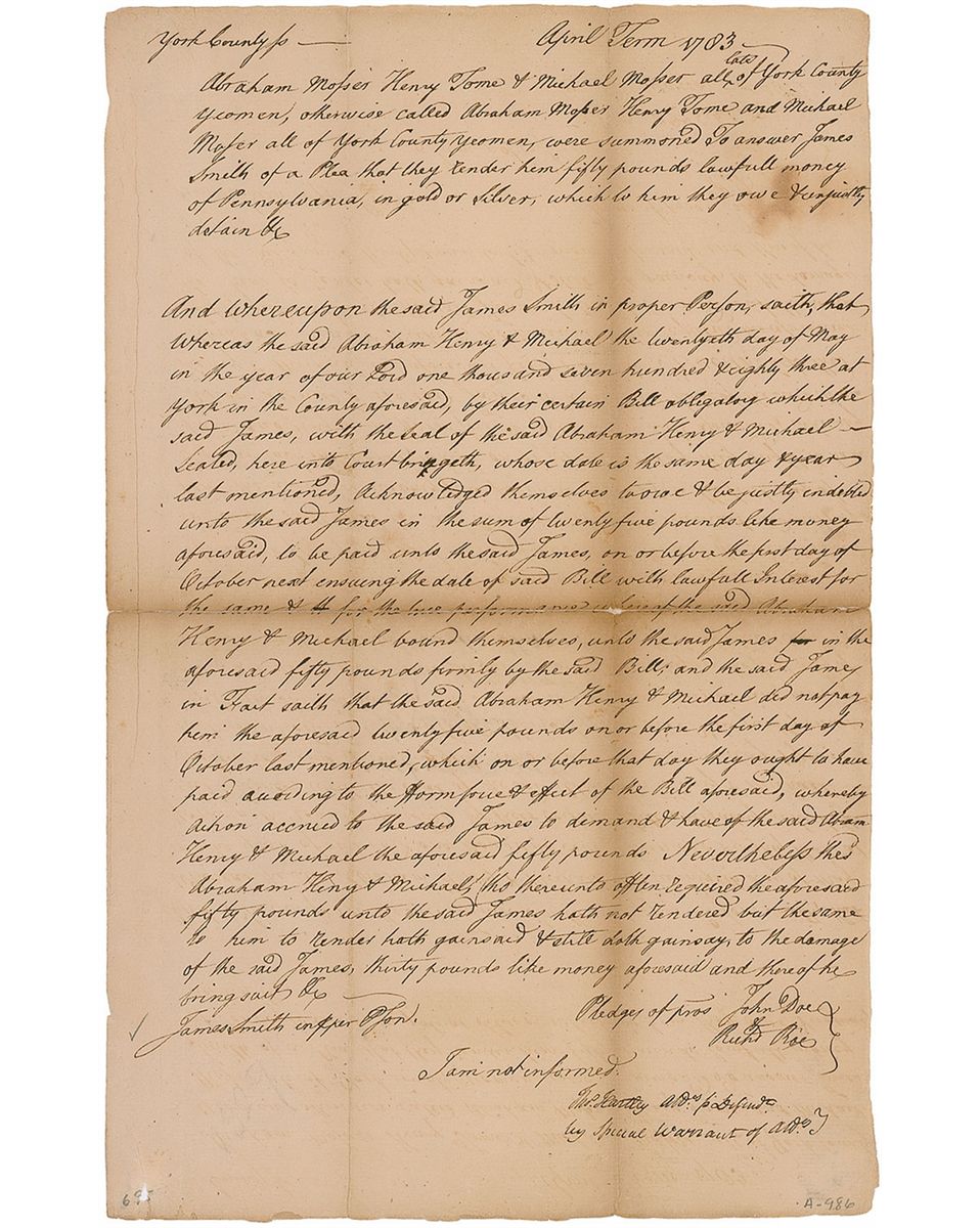Signer of the Declaration of Independence from Pennsylvania (1719–1806). ADS, one page, 8.25 x 13.25, April 1783. Legal document concerning a case between Abraham Moses, Henry Tome, and Michael Mosser against Smith “to answer James Smith of a plea that they tender him fifty pounds lawful money of Pennsylvania in gold or Silver, which to him they owe.” James’s full signature appears twice in the text, and his last name appears an additional four times. Intersecting folds, tape repair to the reverse of the complete central horizontal fold separation, scattered toning, and a small pencil notation, otherwise very good condition.