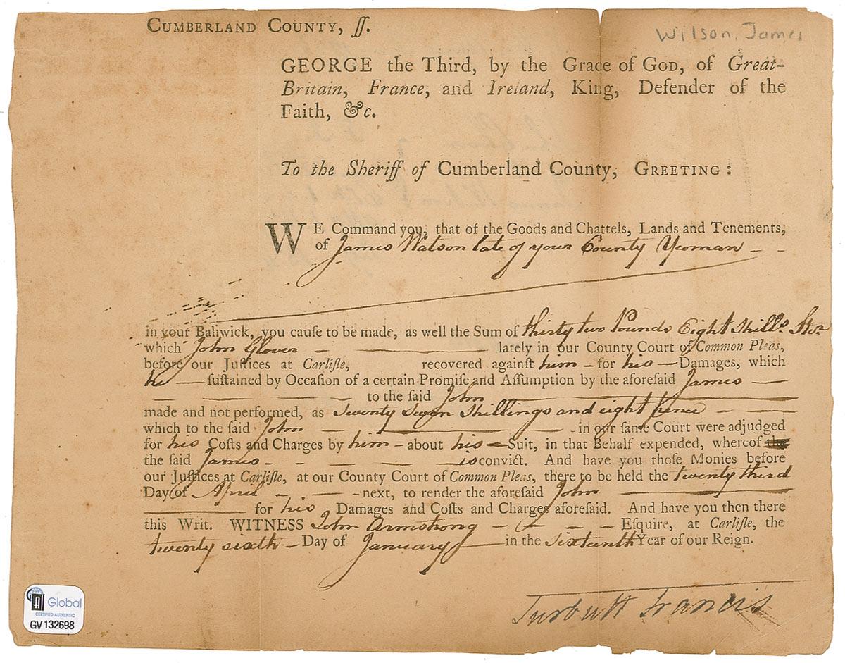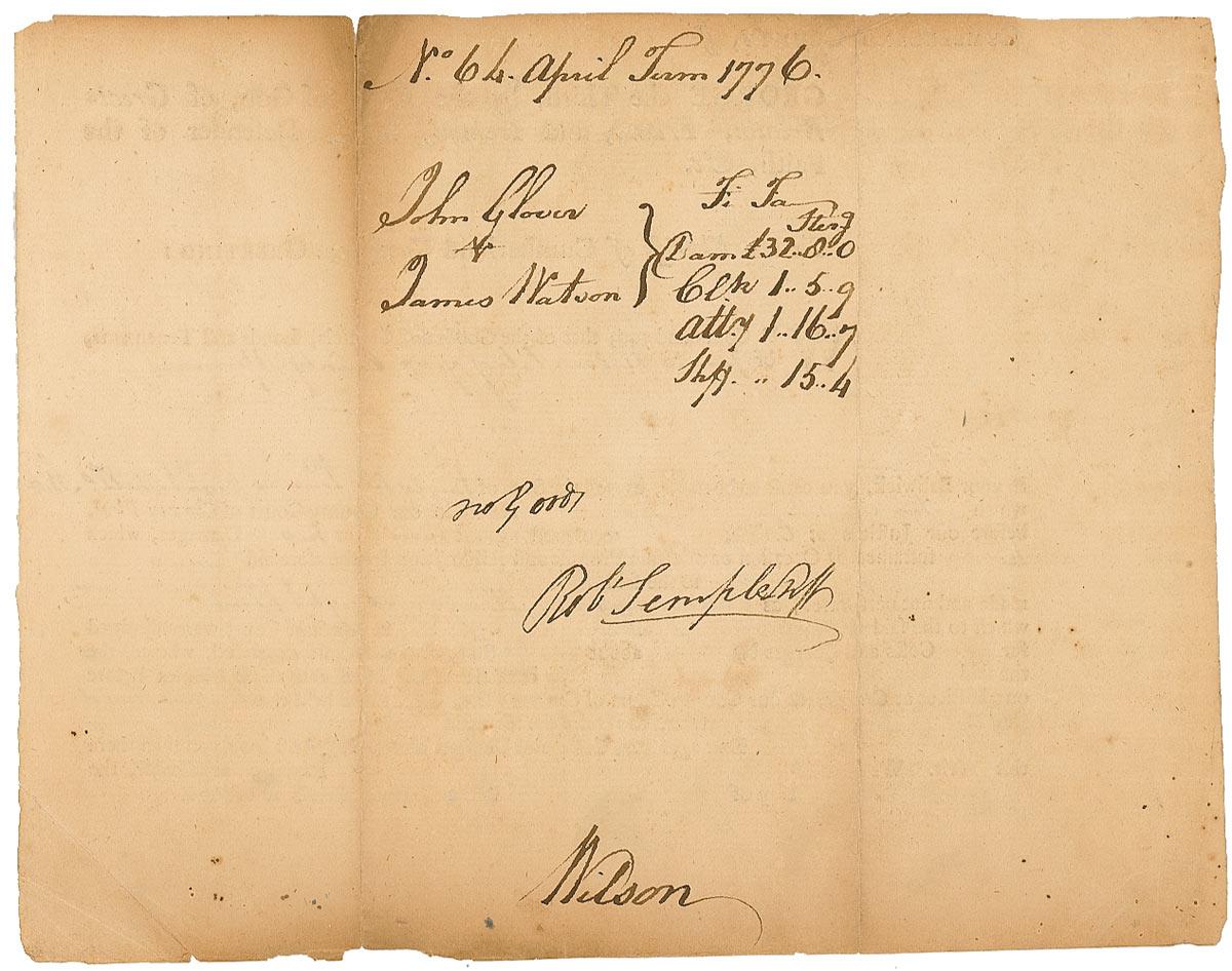 Partly-printed DS, signed “Wilson,” one page, 8.5 x 6.75, January 26, 1776. Legal document directing a payment for damages of thirty-two pounds to John Glover from James Watson. In very good condition, with partial separations along vertical folds, scattered toning, some light edge chipping, and an authentication label affixed to front of document.