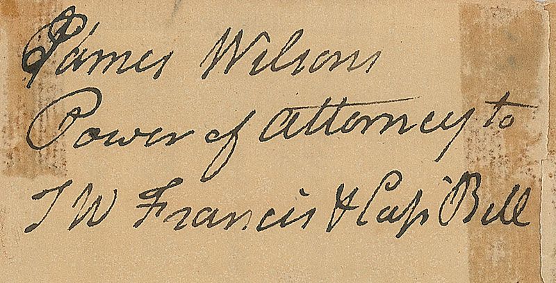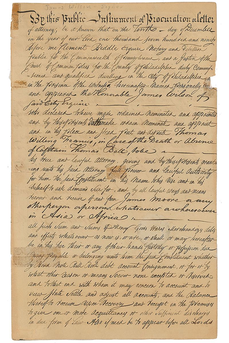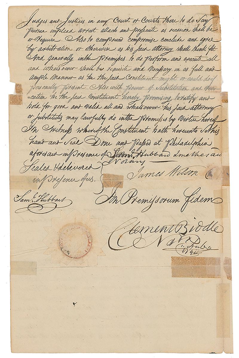 Manuscript DS, one page both sides, 7.75 x 13, December 10, 1790. Wilson appoints an attorney to “sue for, and by all lawful ways and means recover and receive of and from James Moore or any other person or persons whatever or wherever in Asia or Africa all such sum and sums of money goods wares merchandise debts and effects whatsoever” in order to settle debts. Crisply signed at the conclusion by Wilson and witnesses. Various toned tape remnants and complete tape-repaired separations to folds, otherwise very good condition. The affixed paper notary seal remains crisp and fully intact.