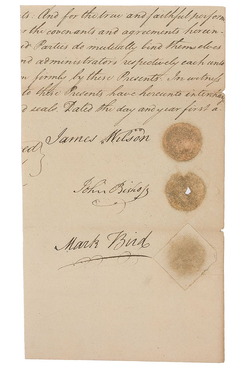 Ink signature, “James Wilson,” on an off-white 4.75 x 8.5 clipped portion of a larger document. Also signed by John Bishop and Mark Bird. In fine condition, with two areas of toning from previously affixed seals.