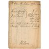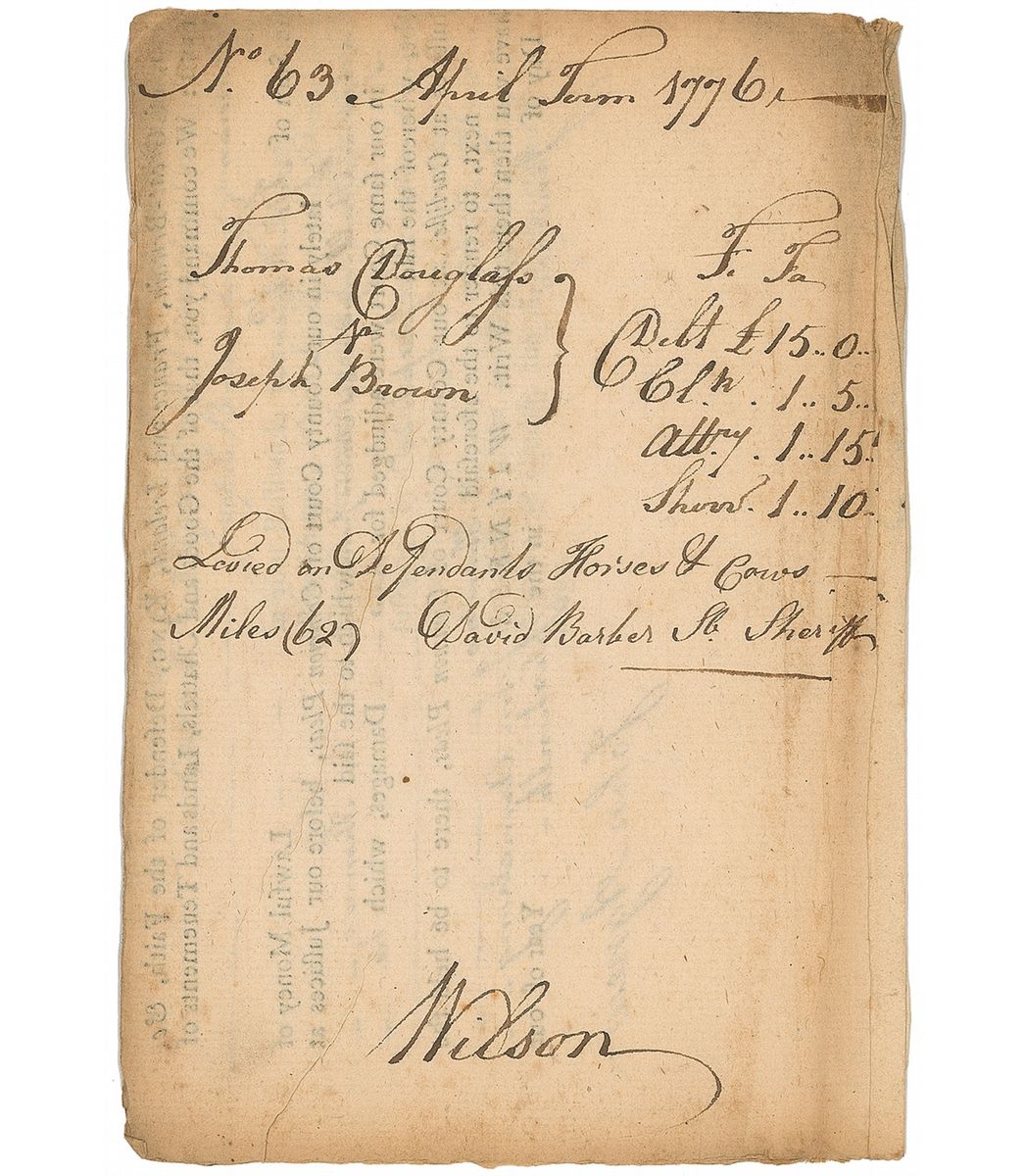 Signer of the Declaration of Independence from Pennsylvania (1742–1798), and one of only six men who signed both the Declaration and the US Constitution. Revolutionary War–dated ink endorsement, “Wilson,” prominently penned on the reverse of a partly-printed document, one page, 13.5 x 4.25, January 26, 1776. The document concerns a debt settlement between Joseph Brown and Thomas Douglas. Several clerical financial notations dated April 1776 appear above Wilson’s signature. In very good condition, with a central fold through the document, scattered creases, and light toning.
