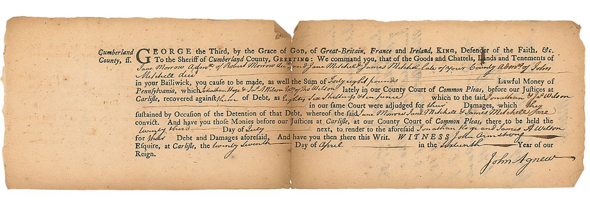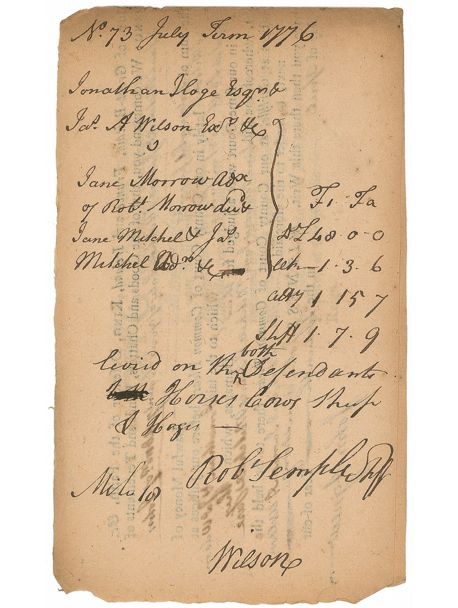 Signer of the Declaration of Independence from Pennsylvania (1742–1798), and one of only six men who signed both the Declaration and the US Constitution. Revolutionary War–dated ink endorsement, “Wilson,” prominently penned on the reverse of a partly-printed document, one page, 13.5 x 4, April 27, 1776. The document concerns a debt settlement. Several clerical financial notations dated July 1776 appear above Wilson’s signature. In very good condition, with a central fold through the document with small edge separations, moderate toning, and some show-through from the opposing side. Wilson was among the 56 delegates who famously issued the Declaration of Independence on July 4, 1776, with this endorsement signature likely signed shortly thereafter.
