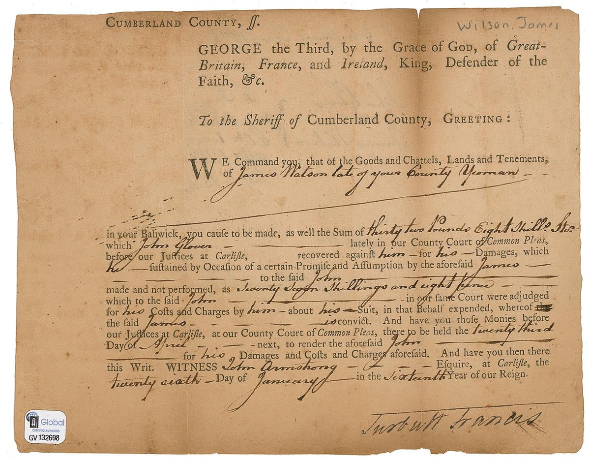 Signer of the Declaration of Independence from Pennsylvania (1742–1798). In 1789, he became one of the original nine justices appointed by Washington to the Supreme Court. Partly-printed DS, signed “Wilson,” one page, 8.5 x 6.75, January 26, 1776. Legal document directing a payment for damages of thirty-two pounds. In very good condition, with partial separations along vertical folds, scattered toning, some light edge chipping, and an authentication label affixed to front of document. Pre-certified John Reznikoff/PSA/DNA and RRAuction COA.