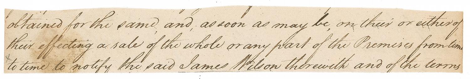 Signer of the Declaration of Independence from Pennsylvania (1742–1798). In 1789, he became one of the original nine justices appointed by Washington to the Supreme Court. Partial ADS, signed in the text, one page, 7.75 x 1.25, no date. Signed portion reads: “…obtained for the same and as soon as may be on their or either of their effecting a sale of the whole or any part of the Premises from time to time to notify the said James Wilson therewith and of the terms ….” Irregular top edge, and a circular spot of toning to left side of signed side, otherwise fine condition.