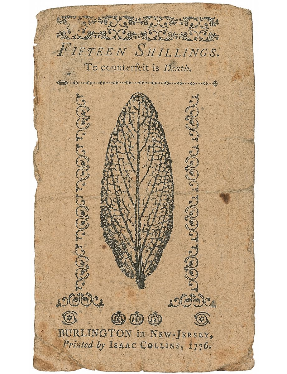 Signer of the Declaration of Independence from New Jersey (1713–1779). Engraved fifteen shilling New Jersey note, printed by Isaac Collins of Burlington, 4.25 x 2.5, dated March 25, 1776, signed in ink by Hart and two others. The reverse of the shilling note states that it was printed in Burlington in New Jersey by Isaac Collins, 1776, and it bears a rather strong warning, as well: “‘To counterfeit is Death.” A central vertical fold, overall creasing and wrinkling, some edge wear, and scattered toning and foxing, otherwise very good condition.