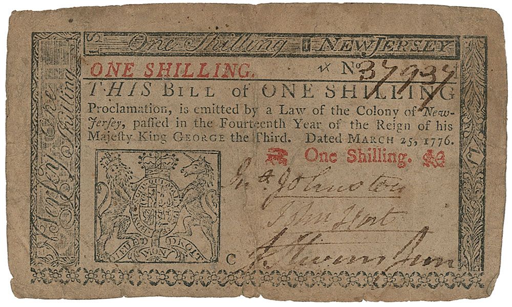 Signer of the Declaration of Independence from New Jersey (1713–1779). Engraved one shilling New Jersey note, printed by Isaac Collins of Burlington, 4.25 x 2.5, dated March 25, 1776, signed in black ink by John Hart, John Johnston, and John Stevens, Jr. A central vertical fold, overall creasing and soiling, and Hart’s signature a shade light, otherwise very good condition.