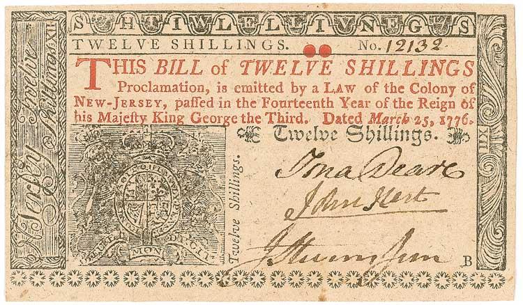 Signer of the Declaration of Independence from New Jersey (1713–1779). Engraved twelve shilling New Jersey note, printed by Isaac Collins of Burlington, 4 x 2.5, dated March 25, 1776, signed in ink by Hart and two others. In fine condition, with uniform light toning, and a bit of light soiling. Pre-certified John Reznikoff/PSA/DNA and RRAuction COA.