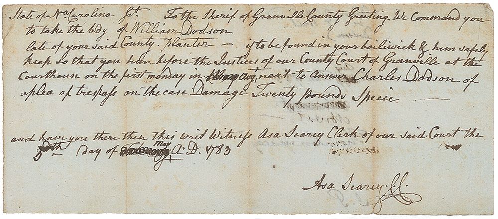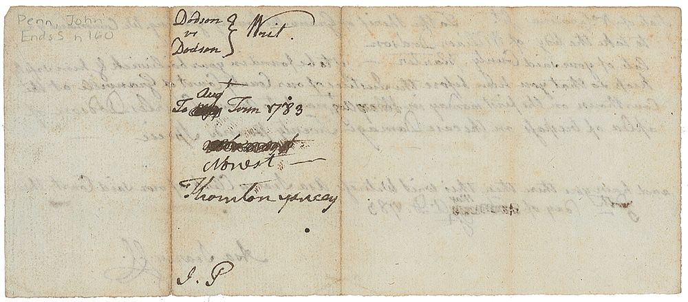 Endorsement signature “J. P.,” on the reverse of a manuscript document, 7.25 x 3.25, dated May 5, 1783, ordering the Granville County Sheriff to arrest William Dodson accused of trespassing by his brother Charles. Penn has also docketed the reverse, “Dodson vs Dodson Writ. To Aug Term 1783,” and initialled the bottom, “J. P.” Three vertical folds, and scattered light toning, otherwise fine condition. In his 1995 reference History Comes to Life, Kenneth Rendell places Penn’s autograph material into the “very rare” category among the Signers.