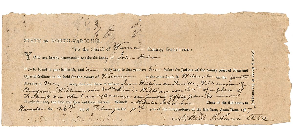 Signer of the Declaration of Independence from North Carolina (1741–1788) who also practiced law and served in the Continental Congress. Partly-printed DS, signed on the reverse, “J. Penn atty,” one page, 10.5 x 4, February 26, 1787. Legal document filled out in Penn’s hand, with his writing represented by brackets in this text. In part: “To the Sheriff of [Warren] County, Greeting: You are hereby commanded to take the bod[y] of [John Hulm] if to be found in your bailiwick, and [him] safely keep so that you have [him]…at the court-house in [Warrenton] on the [fourth] Monday in [May] next, then and there to answer [James Williamson Priscilla Williamson & Benjamin Williamson Exrs Lewis Williamson Decd of a plea of Trespass on the case of Damage one hundred & fifty pounds].” Signed at the conclusion by Marmaduke Johnson, the Warren County clerk, and signed and docketed on the reverse by Penn. All together, the document contains over 40 words in Penn’s hand. Central vertical and horizontal folds, a bit of show-through from docketing to reverse, and areas of ink erosion to Penn’s signature, otherwise fine condition.