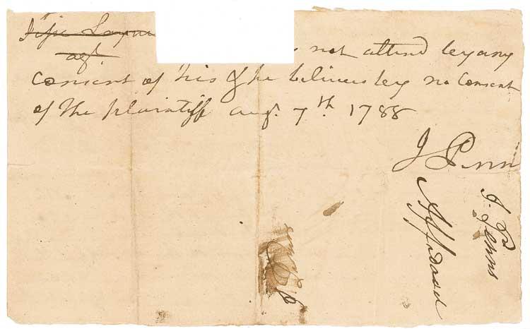 Endorsement signature, “J. Penn,” on a 4 x 6.5 partial manuscript document dated August 7, 1788. In very good condition, with intersecting folds, clipped paper loss to left edge of document, and some light toning and soiling. Penn’s signature is mostly unaffected by the flaws. In his 1995 reference History Comes to Life, Kenneth Rendell places Penn’s autograph material into the “very rare” category among the Signers—an echelon second only to that occupied by the virtually unobtainable Gwinnett and Lynch. Pre-certified John Reznikoff/PSA/DNA and RRAuction COA.