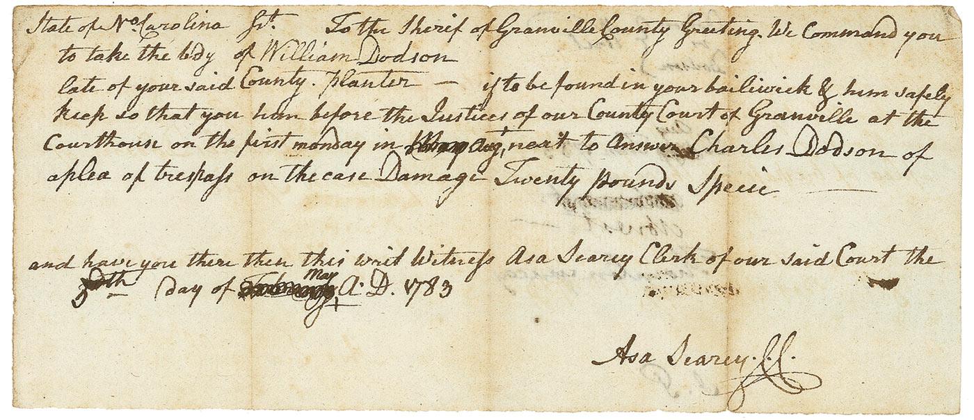ADS, signed “J. P.,” one page, 7.25 x 3, May 7, 1783. Penn orders a North Carolina sheriff to take William Dodson “to answer Charles Dodson of a plea of trespass on the case of Damage Twenty Pounds.” Neatly initialed on the reverse, “J. P.” Some mild toning, a bit heavier along three vertical folds, a couple small pinholes of paper loss along folds, and a couple small creases, otherwise fine condition. Pre-certified John Reznikoff/PSA/DNA and RRAuction COA.