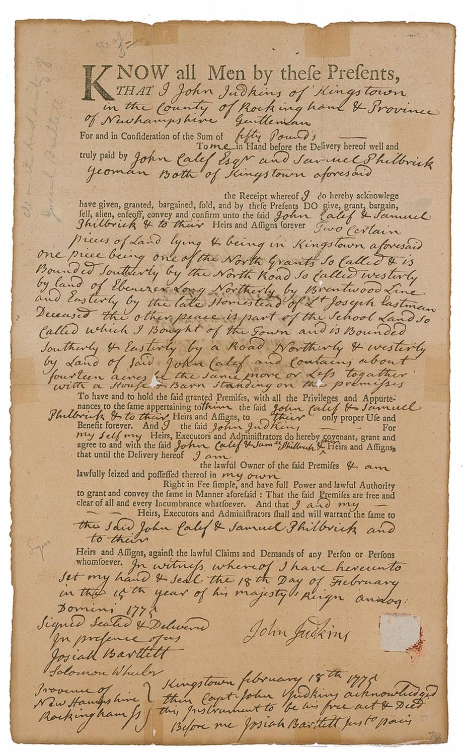 Signer of the Declaration of Independence from New Hampshire (1729–1795). Mostly handwritten by Bartlett, but also partially-printed DS, one page, 7.5 x 12, February 18, 1775. Indenture document, filled in entirely by Bartlett, in which John Jedkins of Kingstown, New Hampshire sells to John Calef and Samuel Philbrick a track of land. In part, “Know all men by the presents that I John Jedkins of Kingstown in the County of Rockingham…for and in consideration of the sum of fifty pounds…truly paid by John Calef…and Samuel Philbrick.” Signed twice by Bartlett, including once at the bottom as a witness. In very good condition, with old tape repairs to strengthen separations along the vertical folds, small holes at the intersection folds, scattered soiling and toning, and light show-through from docketing on reverse. Remnants of a wax seal are intact and Bartlett’s signature is very bold. This historic relic was written just weeks before the Battles of Lexington and Concord.