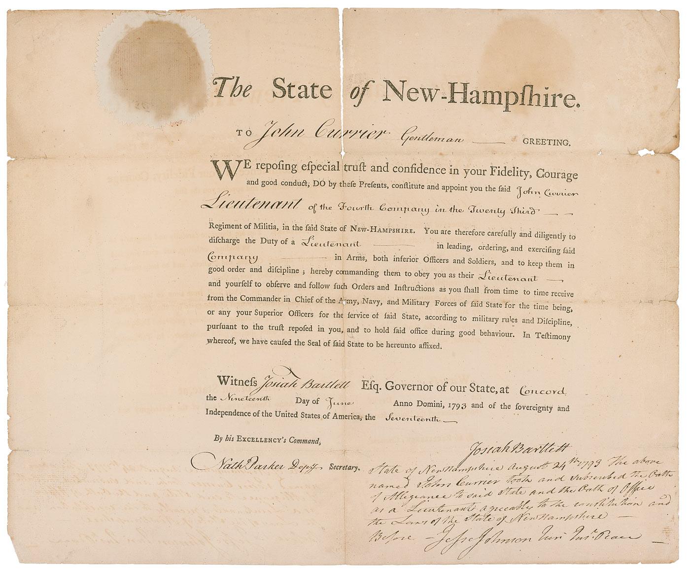 Signer of the Declaration of Independence from New Hampshire (1729–1795). Partly-printed DS, one page, 14.5 x 12, June 19, 1793. Bartlett, as governor of New Hampshire, appoints John Currier “Lieutenant of the Fourth Company in the Twenty Third Regiment of Militia, in the said State of New Hampshire.” Signed at the conclusion by Bartlett, with a Justice of the Peace’s endorsement under Bartlett’s signature. In very good condition, with intersecting folds, with a horizontal fold through signature, partial separations and paper loss to folds, uniform toning, with a heavier circle of toning from seal, and light mirroring of endorsement. The white seal is worn and toned, but intact.