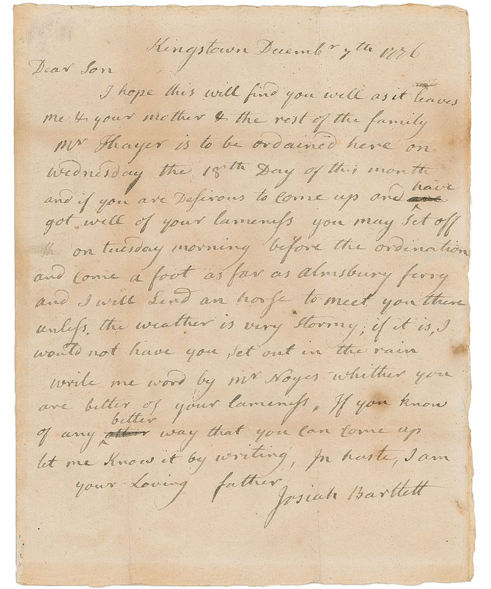 Signer of the Declaration of Independence from New Hampshire (1729–1795). Scarce ALS signed “Your loving father, Josiah Bartlett,” one page, 6.5 x 8.5, December 7, 1776. Letter to his son Levi Bartlett. In full: “I hope this will find you well as it leaves me & your mother & the rest of the family. Mr Thayer is to be ordained here on Wednesday the 18th Day of this month and if you are Desirous to come up and have got well of your laments you may set off on Tuesday morning before the ordination and come a foot as far as Almsbury ferry and I will send an horse to meet you there unless the weather is very stormy; if it is, I would not have you set out in the rain. Write me word by Mr Noyes whither you are better of your lameness. If you know of any better way that you can come up let me know it by writing.” Second integral page bears an address panel in Bartlett‘s hand to “To Levi Bartlett att Dummer’s School.” In very good condition, with intersecting folds, reinforced hinge, one through a single letter of signature, scattered toning, and small area of paper loss to second page from wax seal. According to American Book Prices Current, in the last 40 years, only four ALSs of Josiah Bartlett penned in 1776 have ever been offered for sale at major public auctions.
