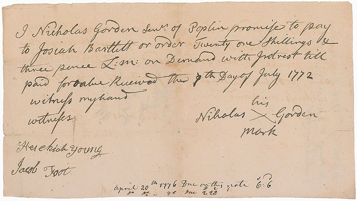 Signer of the Declaration of Independence from New Hampshire (1729–1795). ADS, signed within the text, one page, 7.5 x 4.25, July 9, 1772. Promissory note reads, in part: “I Nicholas Gorden…promise to pay to Josiah Bartlett or order Twenty one shillings & three pence…with interest till paid for value received.” In very good condition, with intersecting folds, some light wrinkling and toning, and a couple of ink notations.