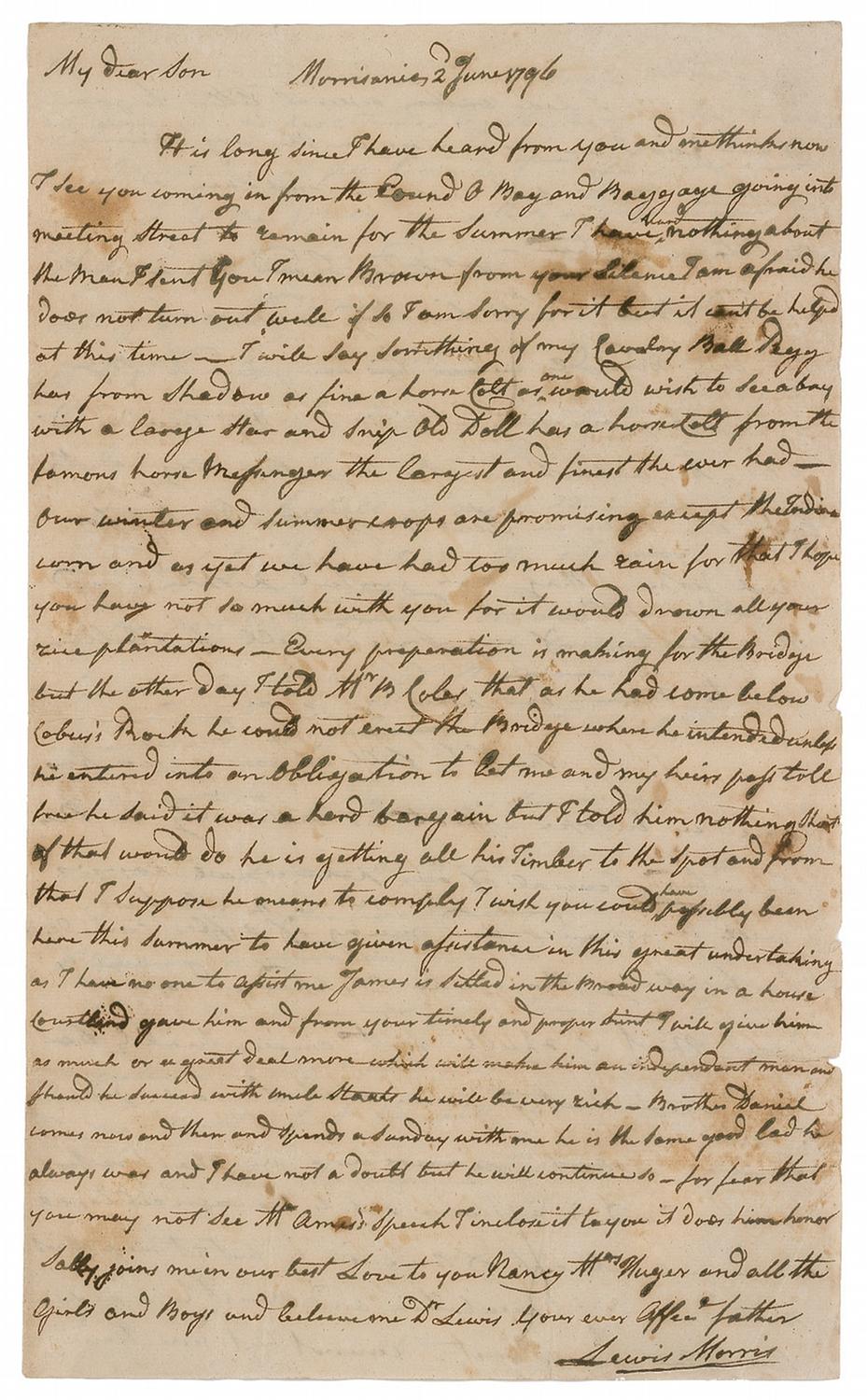 Signer of the Declaration of Independence from New York (1726–1798). ALS, one page, 7.75 x 13, June 2, 1796. Letter to his son, Colonel Lewis Morris, with his son’s response written on the reverse and adjoining page. The elder Morris writes from Morisania, in full (with spelling and grammar retained): “It is long since I have heard from you and one thinks now I see you coming in from the Sound and Bag and Baggage going into meeting street to remain for the Summer I have heard nothing about the man I sent you I mean Brown from your silence I am afraid he does not turn out well if so I am sorry for it but it can't be helped at this time. I will say something of my Cavalry Ball Peggy has from Shadow as fine a horse colt as one would wish to see a bay with a large star and snip old Doll has a horse colt from the famous horse Messenger the largest and finest she ever had -Our winter and summer crops are promising except the Indian corn and as yet we have had too much rain for that I hope you have not so much with you for it would drown all your rice plantations - Every preparation is making for the Bridge but the other day I told Mr B Coler that as he had come below Cobus's Rock he could not erect the bridge where he intended unless he entered into an obligation to let me and my heirs pass toll free he said it was a hard bargain but I told him nothing short o that would do he is getting all his timber to the spot and from that I suppose he means to comply I wish you would have preferably been here this summer to have given assistance in this great undertaking as I have no one to assist me James is settled in the Broadway in a house Courtland gave him and from your timely and proper stint I will give him as much or a great deal more which will make him an independent man and should he succeed with Uncle Staab he will be very rich - Brother Daniel comes now and then and spends a Sunday with me He is the same good lad he always was and I have not a doubt but he will continue so - for fear that you may not see Mr. Ames Speech I enclose it to you it Does him honor Sally joins me in our best love to you Nancy Mr Unger and all the Girls and Boys.” Intersecting folds, scattered toning and foxing, paper loss to second integral page, and wax seal remnants to reverse of second integral page, otherwise very good condition. A lengthy letter from the wealthy land owner.