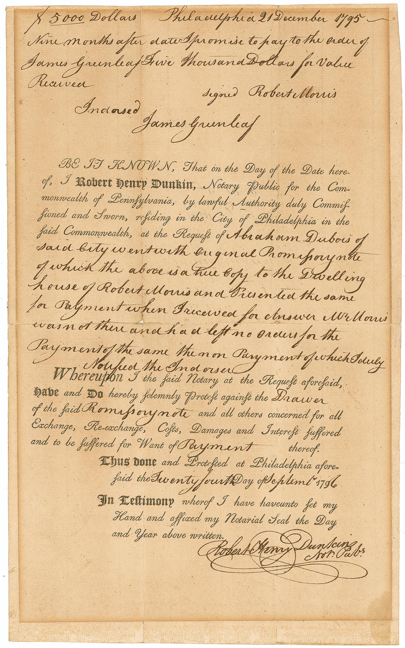Signer of the Declaration of Independence from Pennsylvania (1724–1777). Self-contained partial DS, signed “John Morton, Sheriff,” one page, 6 x 2, no date. Clipped from a larger document with four lines of text in his hand visible. Light vertical crease, tiny tear at top edge, some scattered toning, a penciled notation, and light show-through from text on reverse, otherwise fine condition. Pre-certified John Reznikoff/PSA/DNA and RRAuction COA.