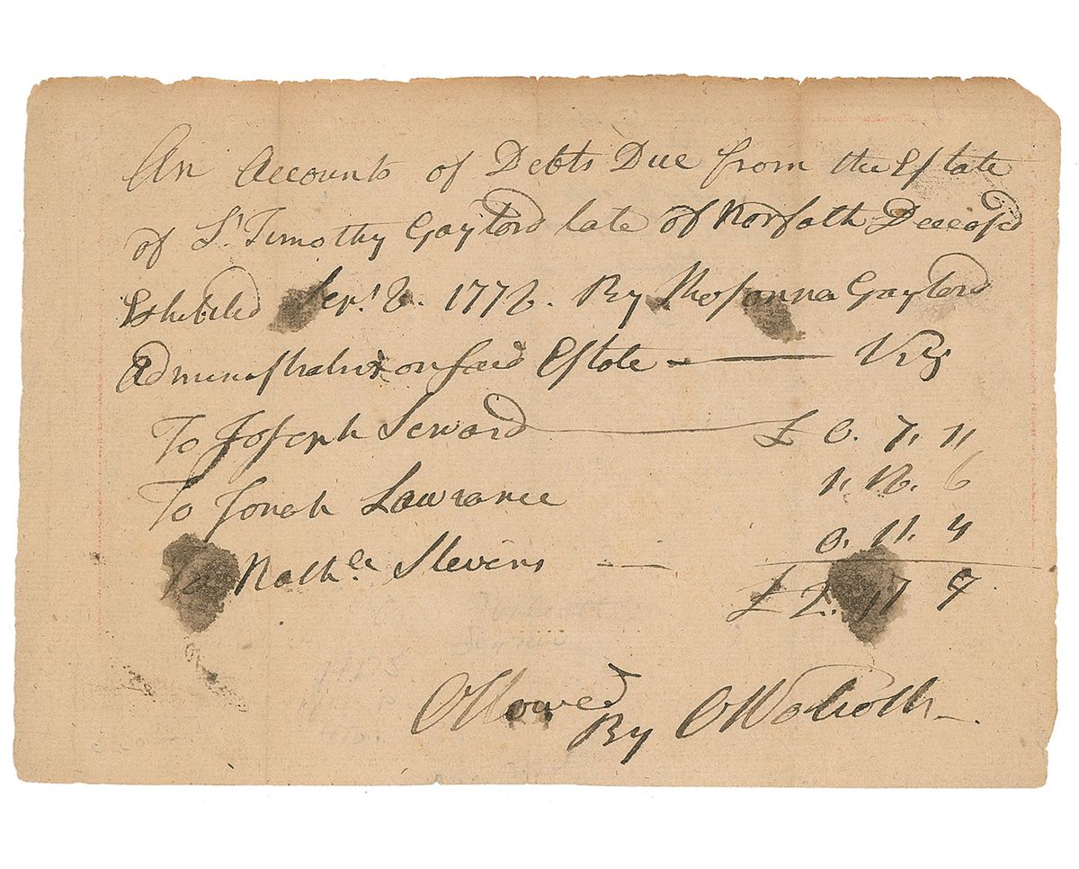 Connecticut politician (1726–1797) who signed both the Declaration of Independence and Articles of Confederation, and later served as governor of the state. Revolutionary War–dated manuscript DS, signed “O. Wolcott,” one page, 7.25 x 5, September 8, 1778. Financial document listing “accounts of debts due from the Estate of S. Timothy Gaylord,” amounting to a total of £2.17.7. Intersecting folds, mild toning, and several stray ink blots, otherwise fine condition.
