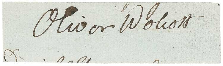American military officer and Signer of the Declaration of Independence from Connecticut (1726–1797). Ink signature, “Oliver Wolcott,” on a light gray 3 x 1 clipped slip. In fine condition, with some light creases and a few stray ink marks. Pre-certified John Reznikoff/PSA/DNA and RRAuction COA.
