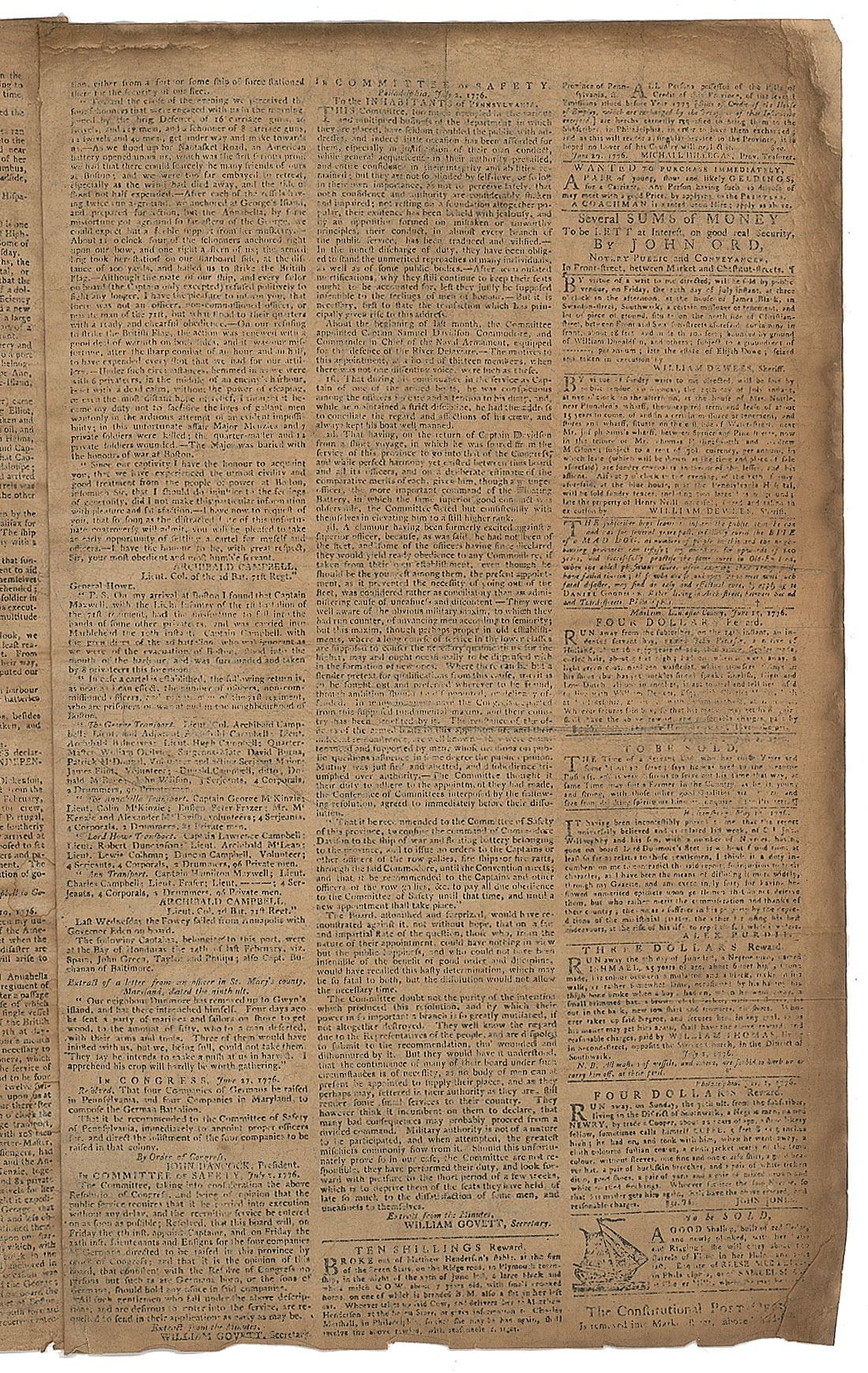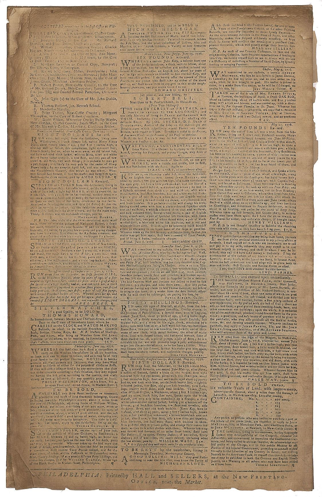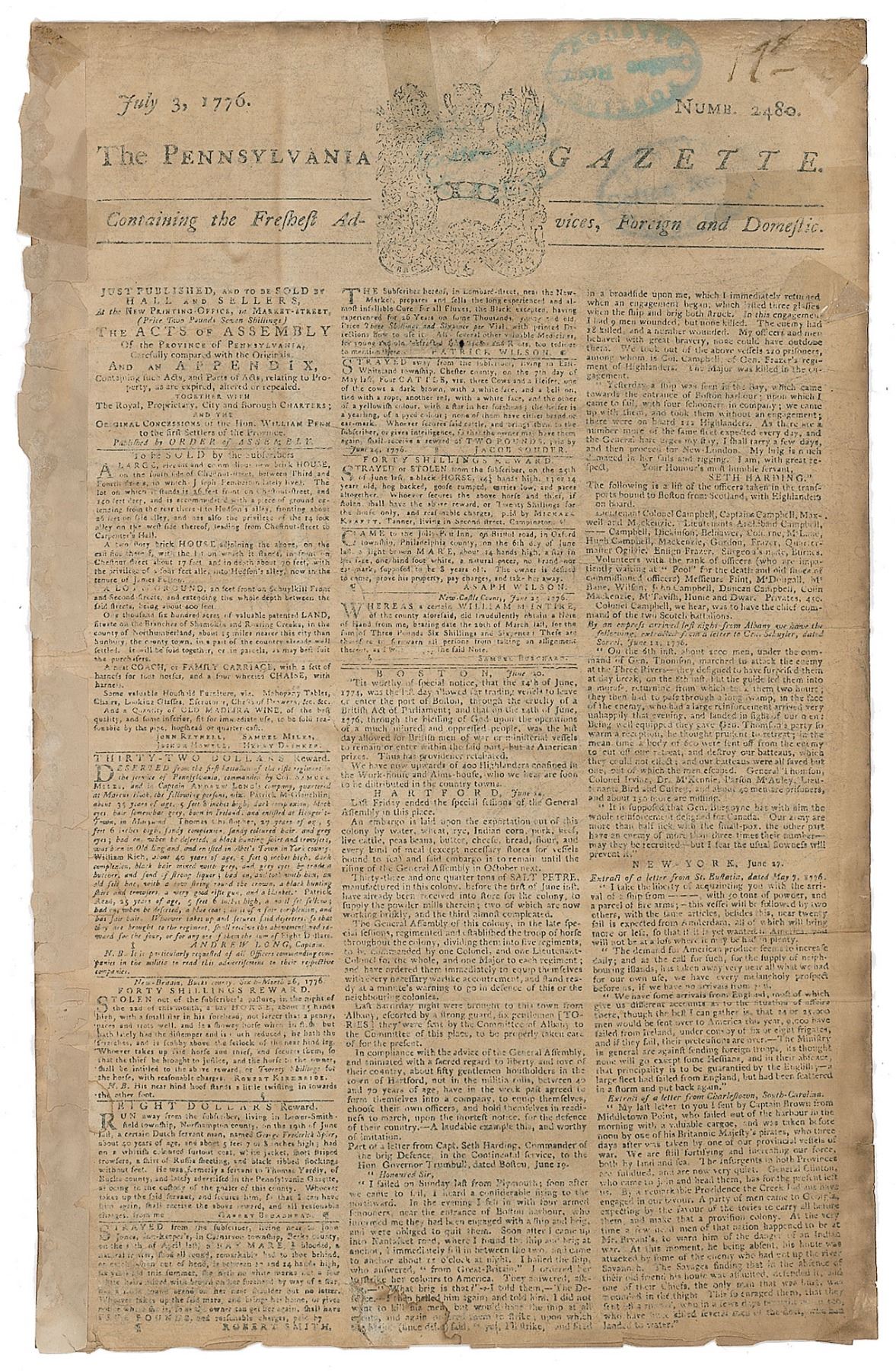 Extraordinary original issue of the July 3, 1776, edition of the Pennsylvania Gazette, four pages, each measuring 8.5 x 13.25, containing the first published announcement of the Declaration of Independence. This appears halfway down the third column of page two, briefly stating: “Philadelphia, July 3. Yesterday the Continental Congress declared the United Colonies Free and Independent States.” In very good condition, with toning, creasing, several horizontal folds, a strip of old mounting remnant along the left edge, and seven pieces of clear tape to the top (six to the edges, and one to the top of the middle column of text).